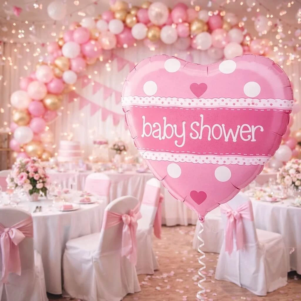 Pink hjerteformet folie ballon med Baby Shower tekst, 45 cm baby shower ballon til pyntPink hjerteformet baby shower ballon i pyntet festlokale med kage, gaver og baby shower dekorationerPink baby shower festlokale med ballonbue, bordpynt og hjerteformet baby shower ballon