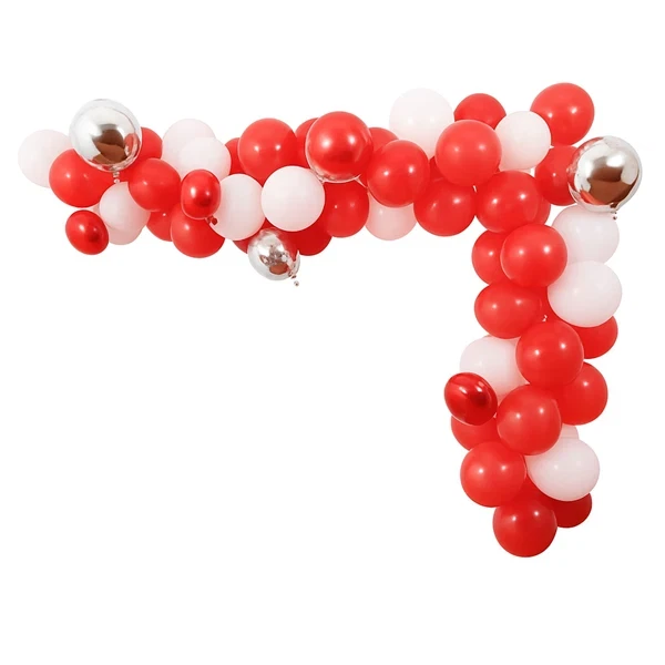 Ballonbuen bygges af dannebrogsfarvede balloner – røde og hvide – med et festligt touch af sølv. Der medfølger alt – inkl. vejledning – i ballonbue-kittet. Der er i alt 70 balloner, og der medfølger også ballonbånd til at montere balloner på og limprikker til at fæstne dem med.