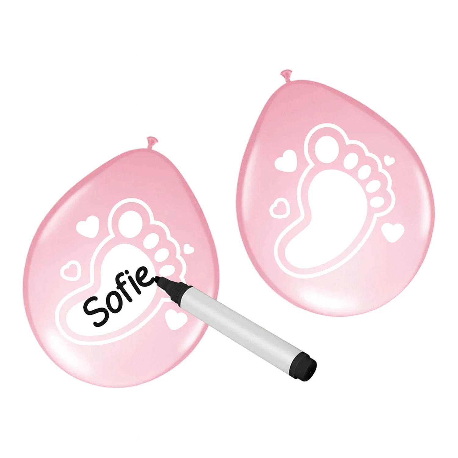 Skab en uforglemmelig stemning til babyshower eller barnedåb med disse søde lyserøde balloner med babyfødder. Ballonerne har et praktisk skrivefelt, hvor du kan tilføje navne og bruge dem som unikke bordkort – en kreativ og personlig detalje, der vil glæde dine gæster.