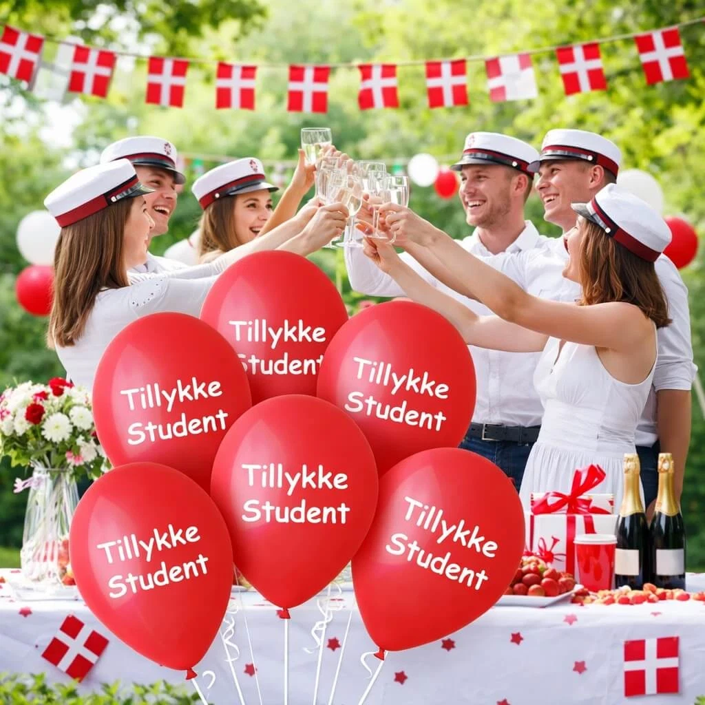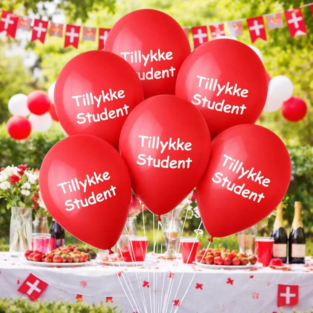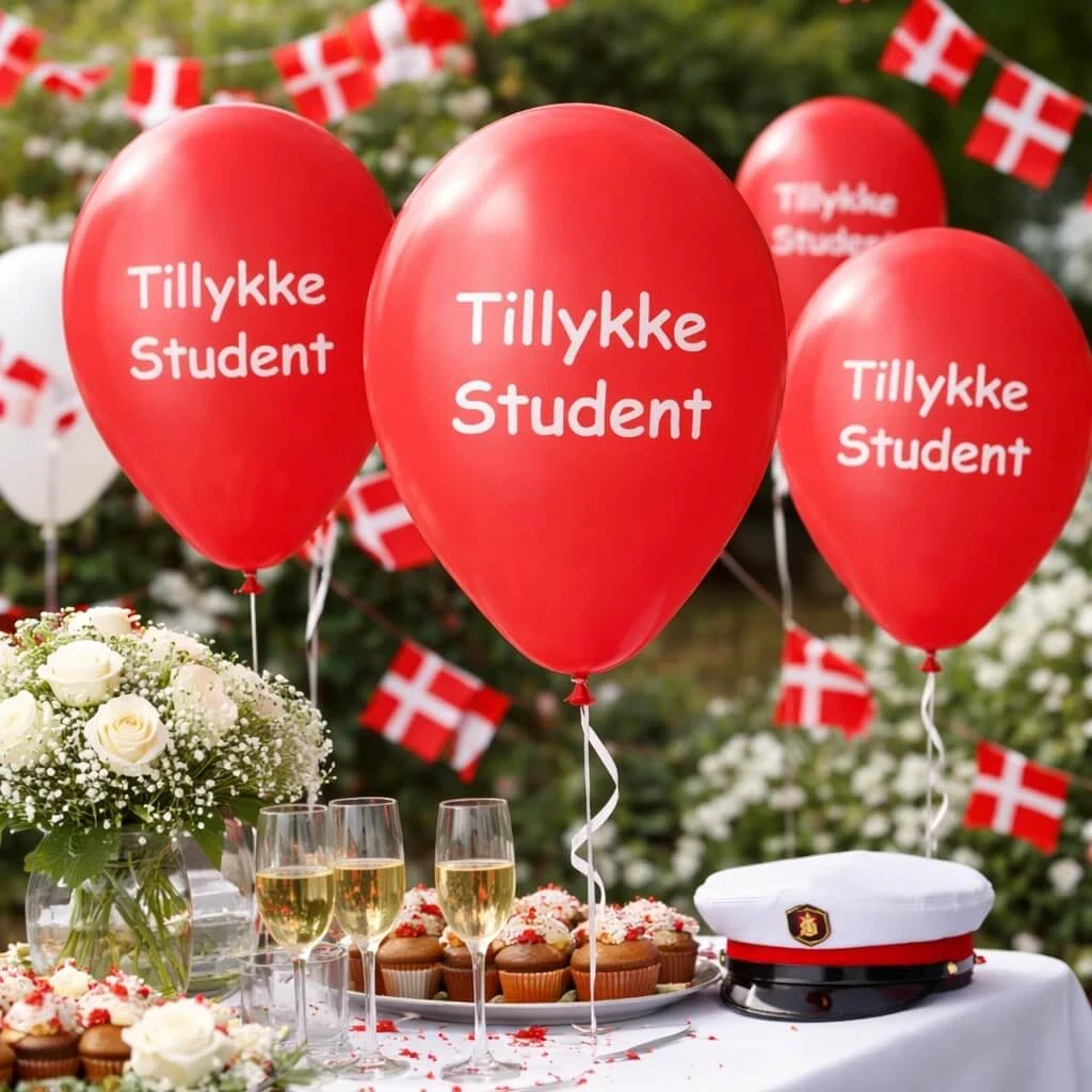 • Røde balloner med “Tillykke Student”-tryk