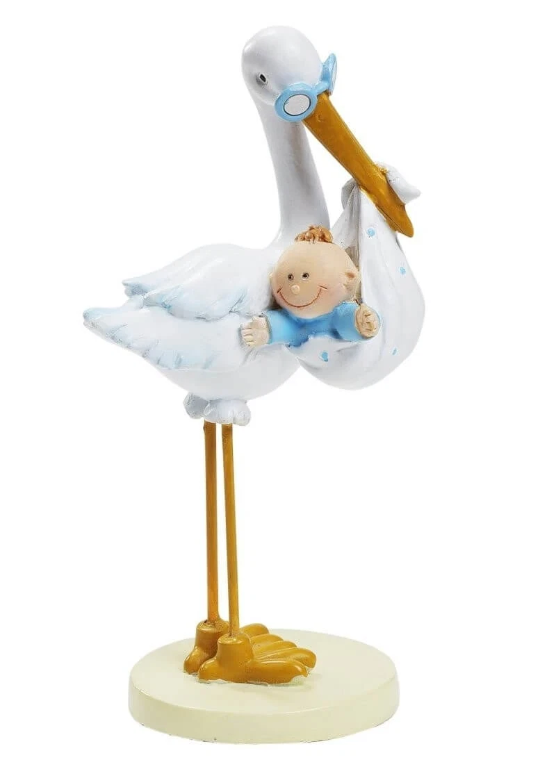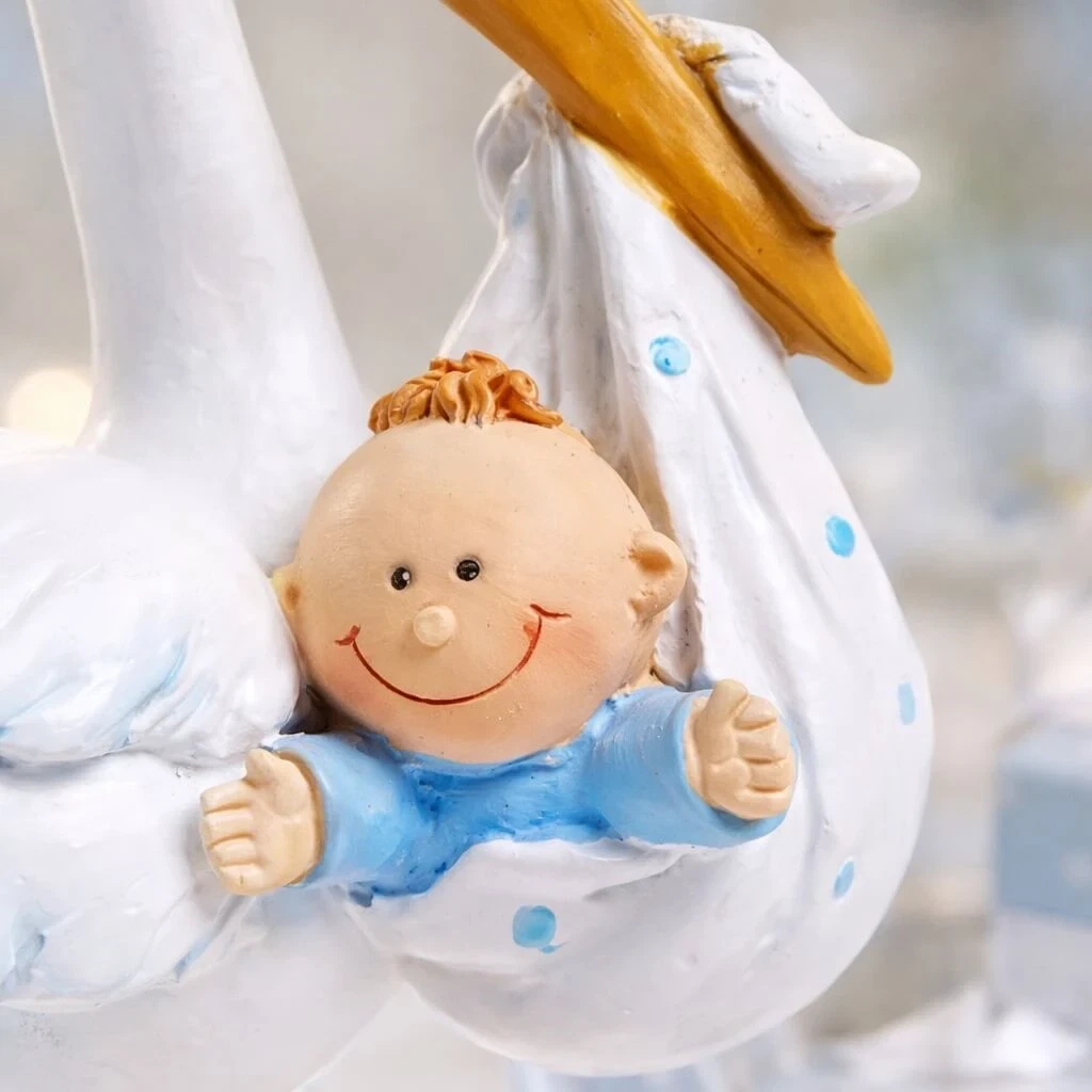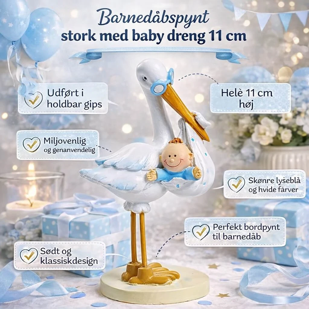 En stork med baby er perfekt som bordpynt til barnedåb dreng, hvor den skaber en sød og personlig stemning. Den kan også bruges til baby shower, gavebord eller som dekoration i hjemmet.