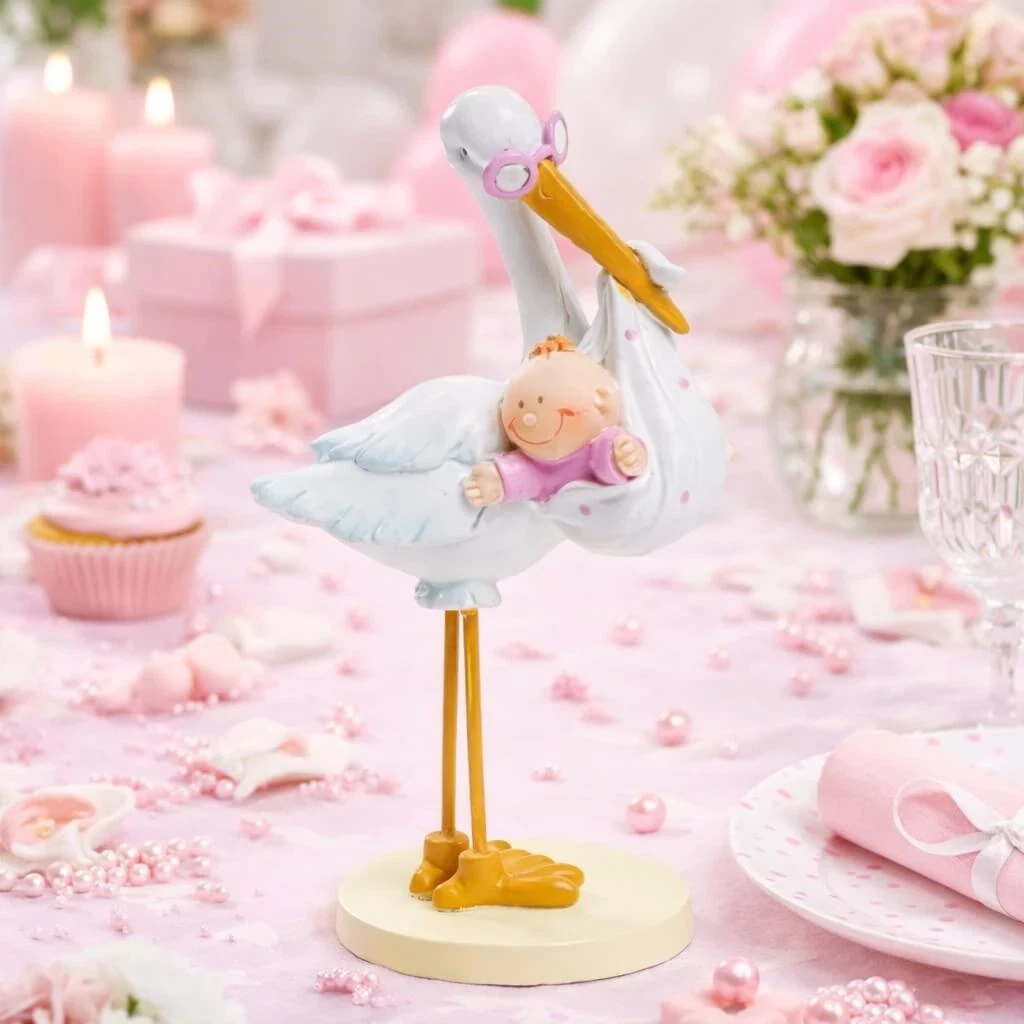 Skab euforglemmelig og kærlig atmosfære til barnedåb eller baby shower med denne elegante stork med baby pige. Figuren måler 11 cm og er udført i holdbar gips med fine detaljer i lyserøde og hvide nuancer – perfekt som bordpynt eller dekorativ detalje.