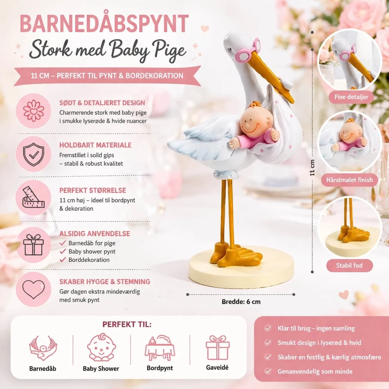 Barnedåbspynt stork med baby pige 11 cm i lyserød og hvid på hvid baggrund – bordpynt til barnedåb og baby showerBarnedåbspynt stork med baby pige på smukt dækket bord i lyserøde nuancer til baby shower og barnedåbBarnedåbspynt stork med baby pige på bord dækket i lyserøde farver til baby shower og barnedåbClose-up af stork med baby pige i lyserød – detaljeret barnedåbspynt til baby shower og borddekorationInfografik af barnedåbspynt stork med baby pige 11 cm i lyserød og hvid – bordpynt til barnedåb og baby shower
