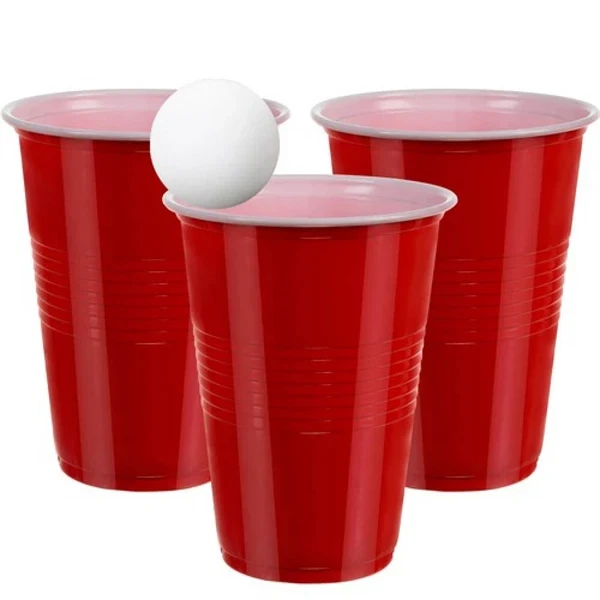 • Slidstærke plastikkopper i ikonisk rød beer pong-stil