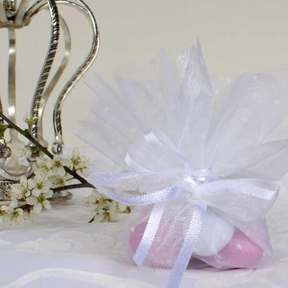 • Tyl i metermål: Vil du gøre det helt fra bunden, kan du købe tyl eller organza i metermål. Klip cirkler på ca 25 cm i diameter, fyld ris på midten og bind dem sammen med et bånd. Se Kija-Design.dk store udvalg af både tyl, organza og bånd.