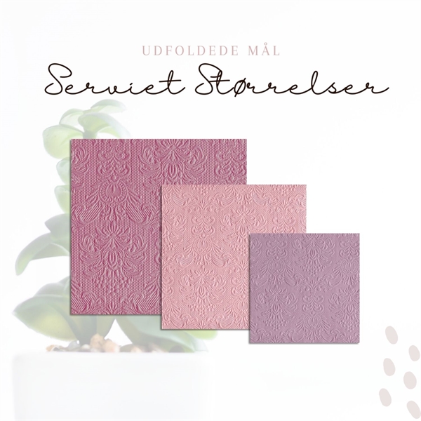 Du kan med fordel kombinere størrelserne, hvis du vil lave/folde flotte servietkreationer. Det vil selvfølgelig være mest iøjnefaldende, hvis du vælger en matchende eller kontrasterende farve/mønstrer. Men det kan også give en flot effekt, hvis det er den samme farve, der går igen i begge servietter.
