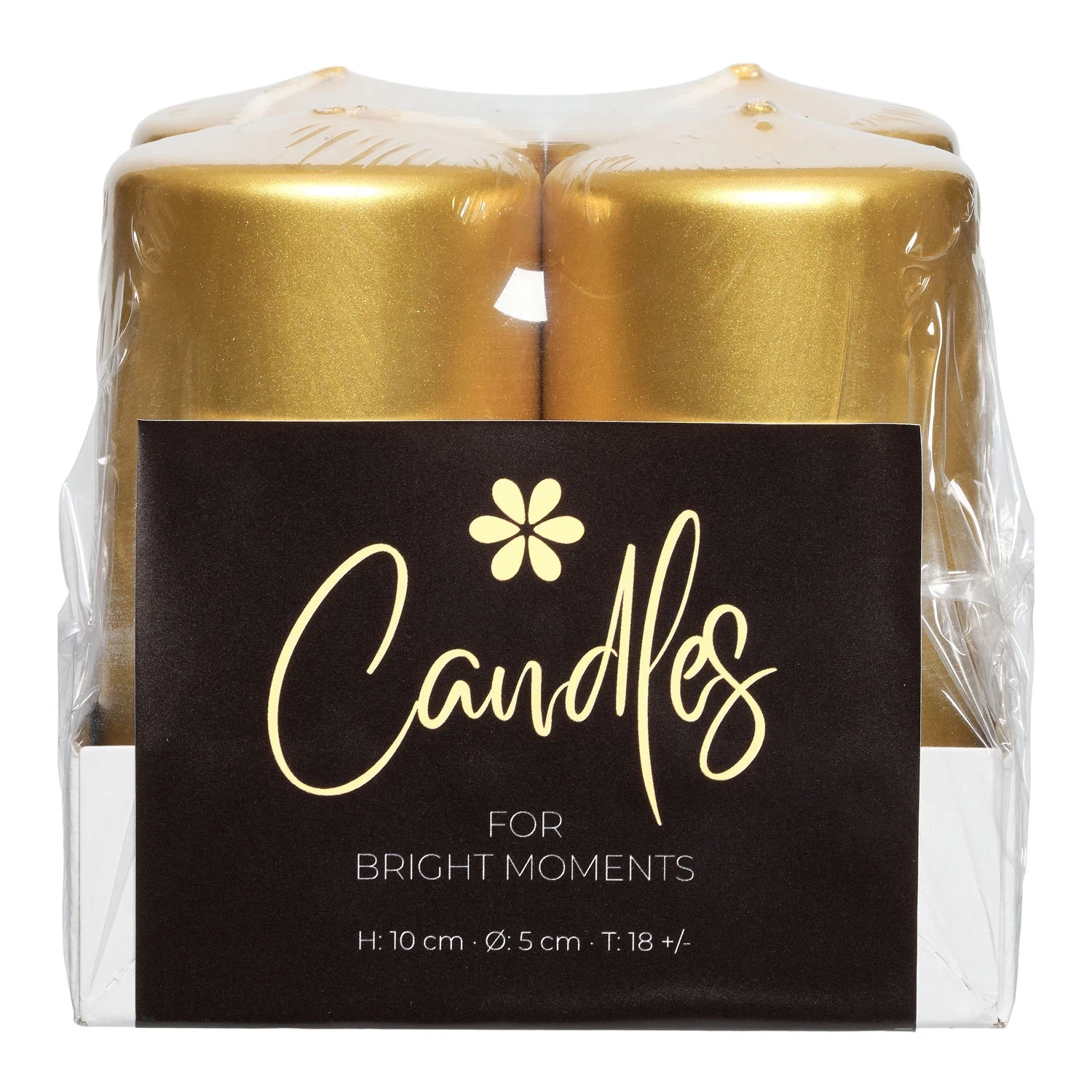 Disse guld bloklys i sæt á 4 stk. er den perfekte detalje til din borddækning, hvis du ønsker at fremhæve et guld‑tema ved festlige lejligheder. Hvert lys måler 5 cm i diameter og 10 cm i højden, og med en brændetid på cirka 18 timer får du masser af stearinlys til både bryllup, guldbryllup, konfirmation, jul eller hvilken fest du nu skal holde.