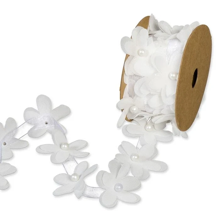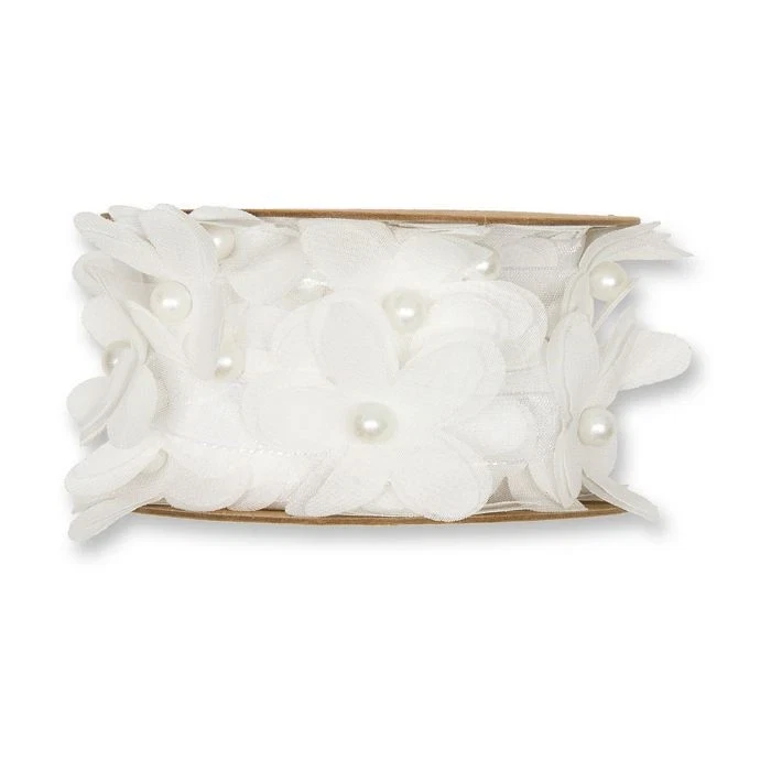 Dette elegante hvide bånd med fine blomster og perledetaljer er perfekt til dig, der ønsker at skabe et eksklusivt og romantisk udtryk. Båndet er fremstillet i let transparent stof og dekoreret med små blomster, der giver en luksuriøs finish til både gaver og kreative projekter.