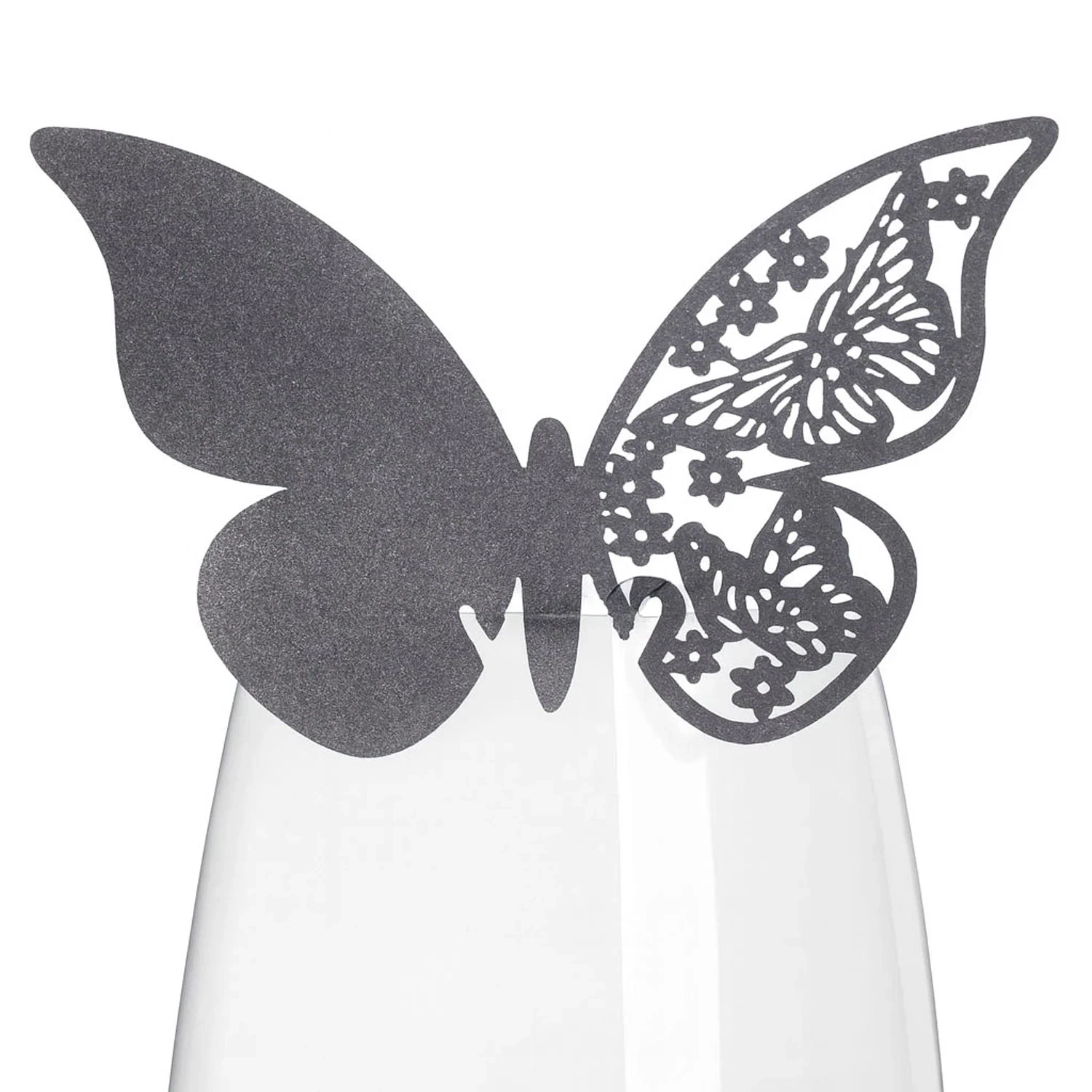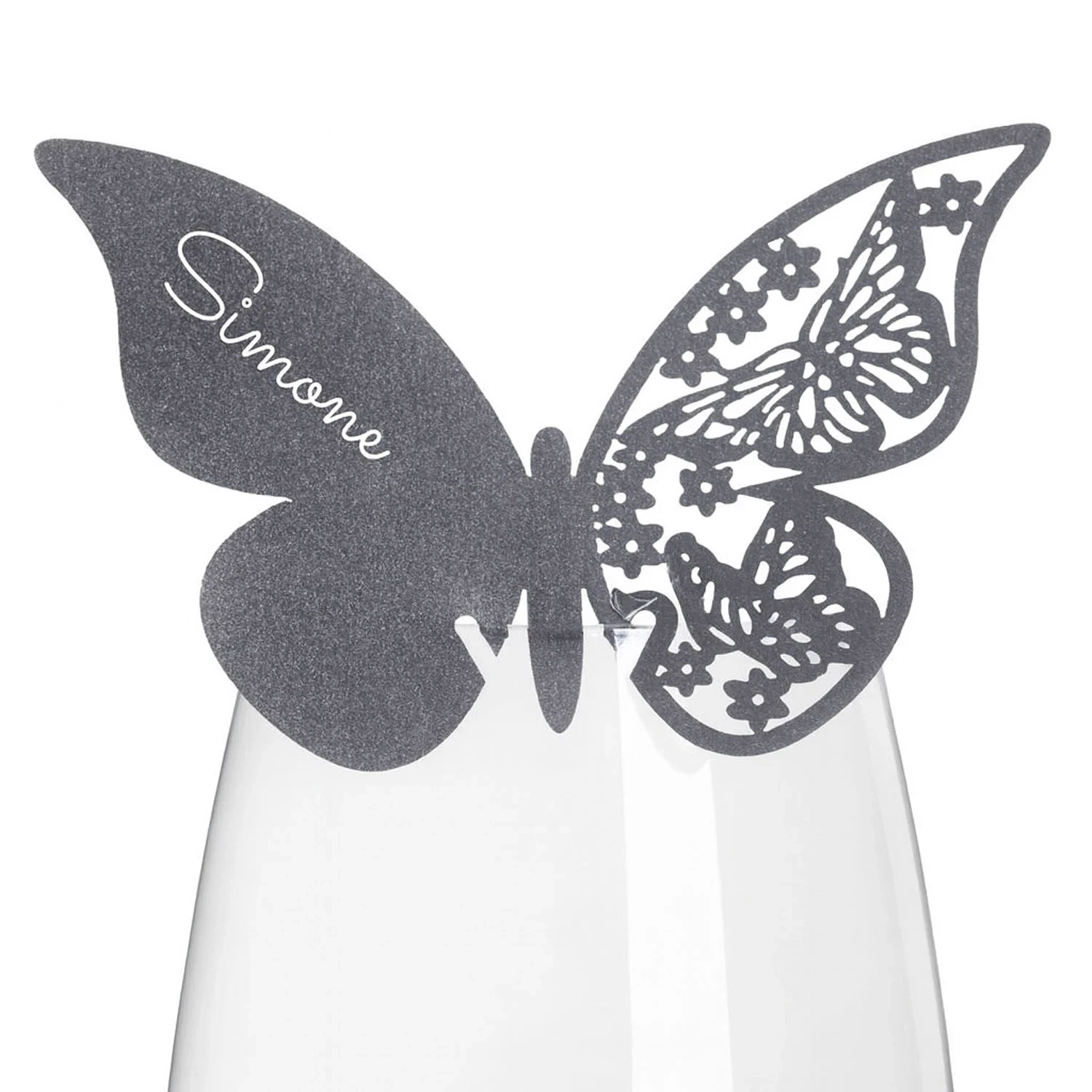 Dette bordkort er skåret som en sort sommerfugl og er velegnet til at sætte på glaskanten. Det vil give dit veldækkede festbord et let og elegant udtryk. Bordkortet er mørkegrå med shinny effekt. Bestil dem i dag, og vis dine gæster deres plads ved bordet med stil.