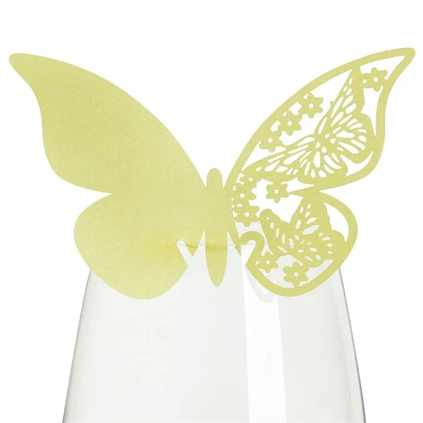 Den er slet ikke til at stå for denne limegrønne sommerfugl, der sidder på kanten af glasset. Lige klar til at lette og flyve sin vej. Men den gør det heldigvis ikke, det ville blive et frygteligt rod, når dine gæster skal finde deres pladser. For sommerfuglen skal nemlig bruges som bordkort. Bestil dem i dag, og vis din gæster deres plads ved bordet.