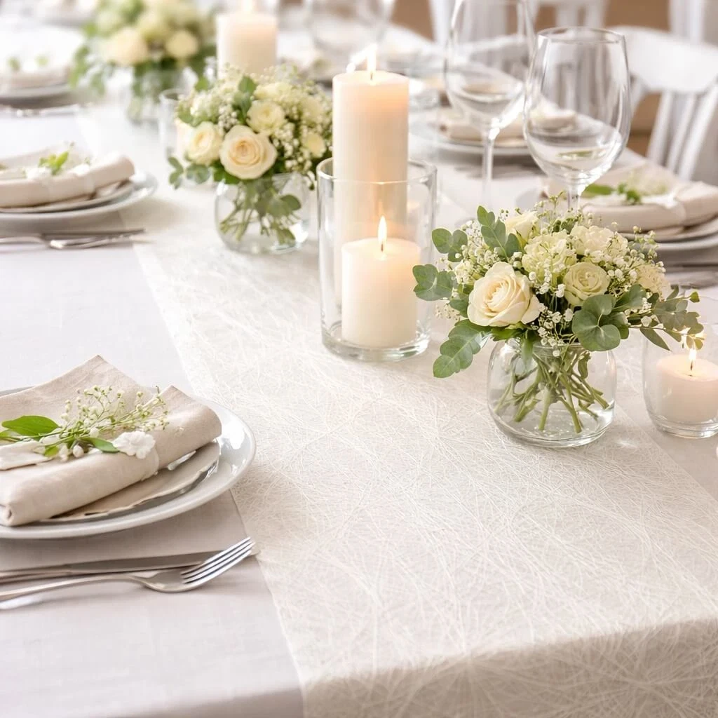 Elegant festbord dækket med råhvid Sizoweb bordløber, hvide blomster og levende lysBordløber Sizoweb råhvid 30cm x 25m. festartiklerRåhvid Sizoweb bordløber 30 cm x 25 m rulle til elegant borddækning