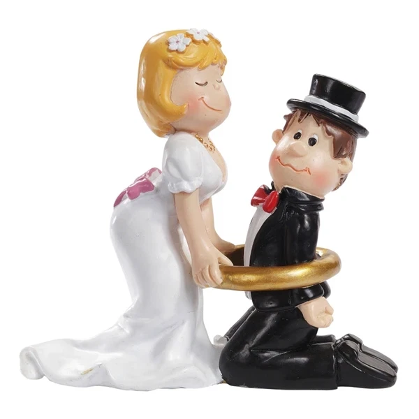Skal du og din mand snart holde bryllup, og er I den humoristiske type, der synes, at det er vigtigt ikke at tage det hele for højtideligt? Så er denne sjove bryllupsfigur med bruden, der har indfanget gommen i vielsesringen den perfekte bordpynt eller topfigur til jeres bryllup.