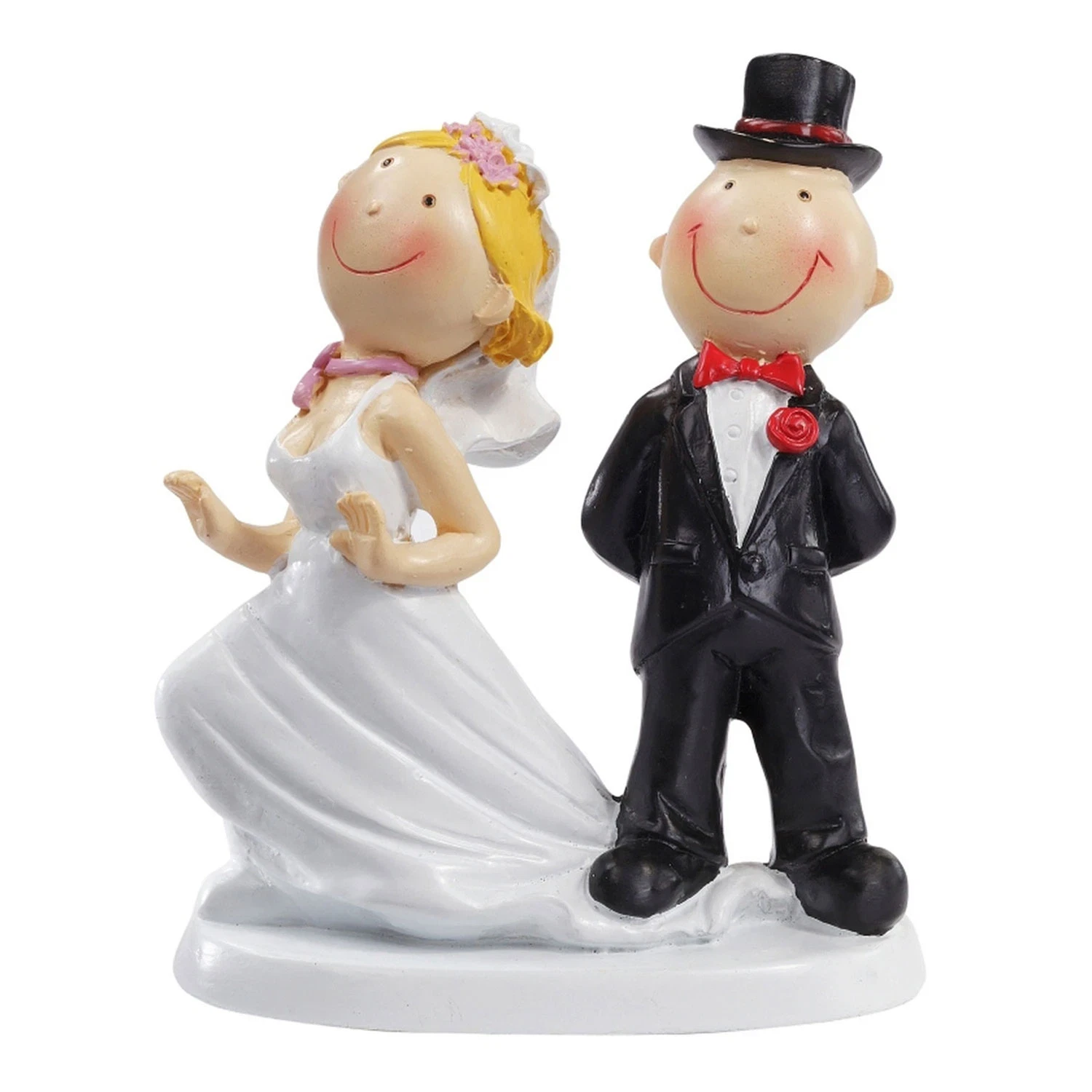 Få dine gæster i godt og festligt humør til dit bryllup med denne sjove og søde bryllupsfigur, hvor gommen træder på sin bruds brudekjole. Modig gjort. Er du lige så modig, så du tør bruge denne bryllupsfigur til topfigur på bryllupskagen eller til bordpynt til dit bryllup?