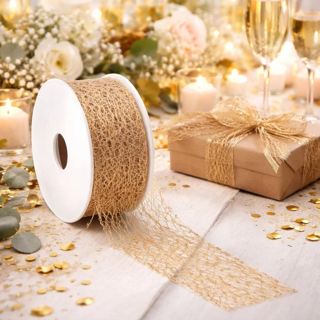 Crispy Deluxe bånd i guld brugt til gaveindpakning på festligt pyntet bord med lys og blomsterCrispy Deluxe bånd i guld 30 mm x 10 m – dekorativt gavebånd på rulleCrispy Deluxe bånd i guld brugt til gaveindpakning på elegant festbord med blomster og lys
