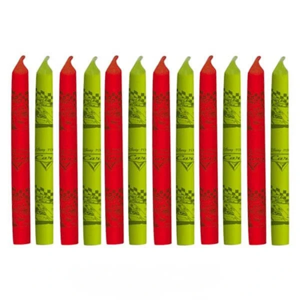 Hele pakken med 12 Disney Cars lagkagelys i rød og lysegrøn inklusiv hvide lysholdere til fødselsdagskage.Pakke med 12 Disney Cars lagkagelys i rød og grøn med holdere og motiv af Lyn McQueen til fødselsdagskage.Nærbillede af 12 Disney Cars lagkagelys i rød og lysegrøn med ternet flag og Lyn McQueen grafik.To Disney Cars lagkagelys i rød og grøn med Lyn McQueen grafik og ternet flag-motiv.
