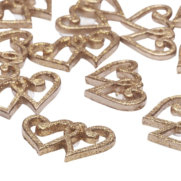 Dobbelt Hjerter med glimmer og klæbepude guld 4cm, 12 stk. bryllupspynt