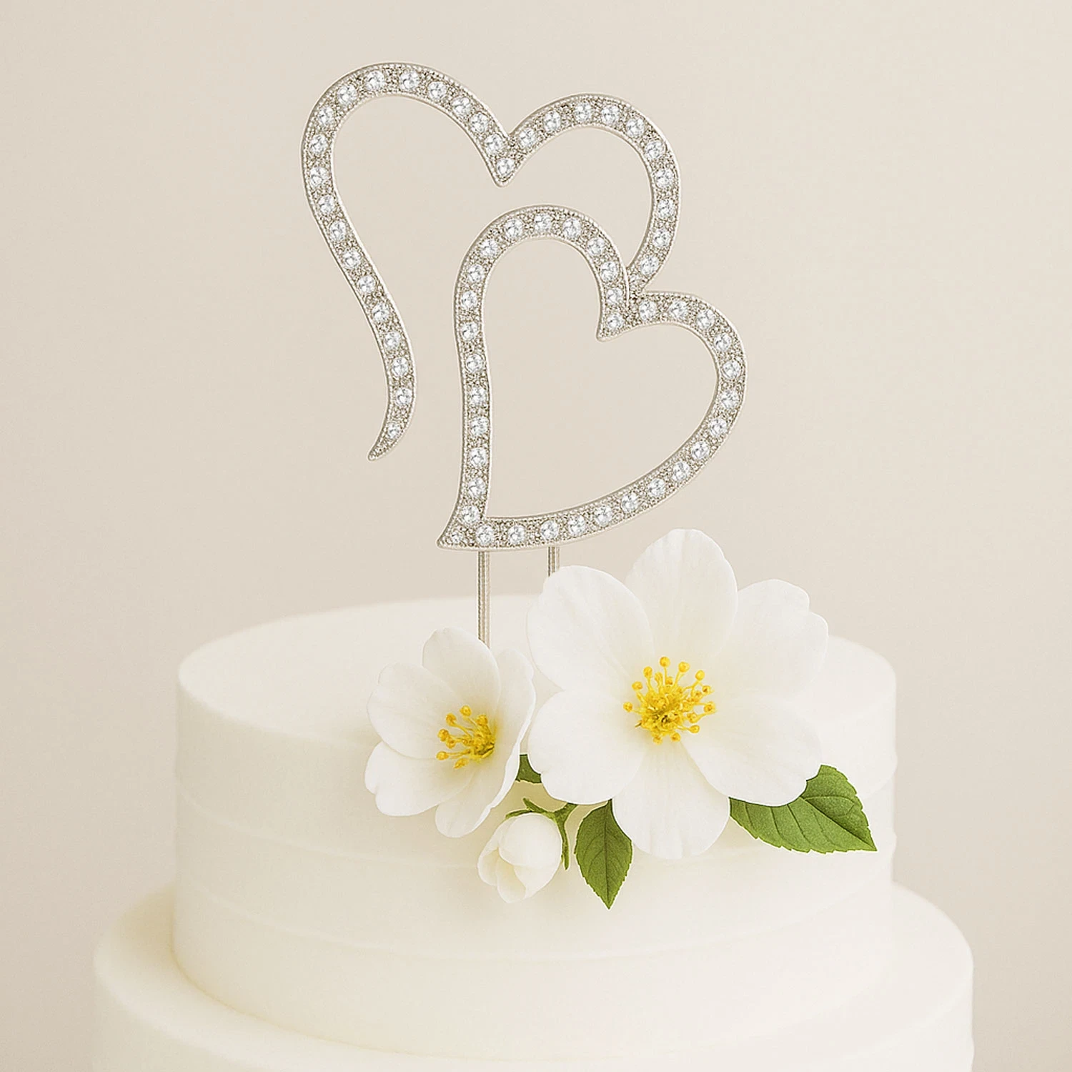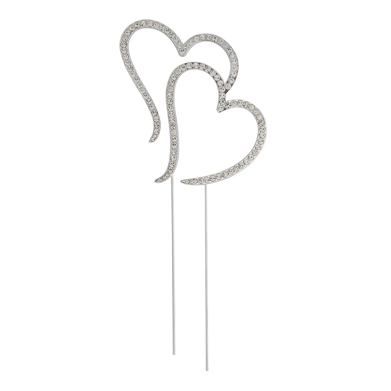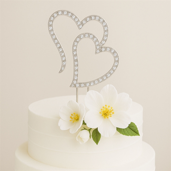 Forestil dig en bryllupskage, der stråler af elegance og romantik – med dette dobbelte hjerte på pind dekoreret i glimtende sølv og facetterede krystaller skaber du den perfekte caketopper eller en eventyrlig dekoration. De skinnende krystaller fanger lyset fra enhver vinkel og tilfører et sofistikeret og festligt touch til både bord og kage – en lille detalje, der gør en stor forskel.