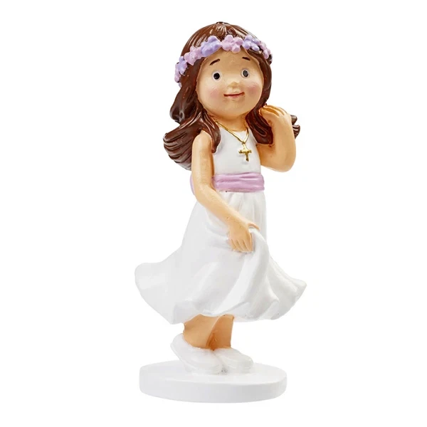 Den yndige, unge pige med brunt hår står på en flad rund base, så den kan stå på festbordet. Den kan også bruges som dekoration på sangskjuleren ved at sætte den fast med lim eller dobbeltklæbende tape.