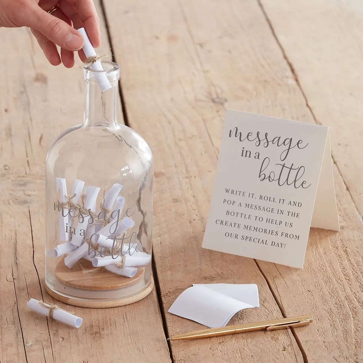Denne gæstebog er en supersjov og meget anderledes måde at få samlet beskeder fra gæsterne på. ”Flaskepost. Skriv den, rul den, og prop en besked i flasken, og hjælp os med at skabe minder fra vores specielle dag”, står der på det medfølgende skilt. Bestil gæstebogen i dag, og få et helt unikt minde.