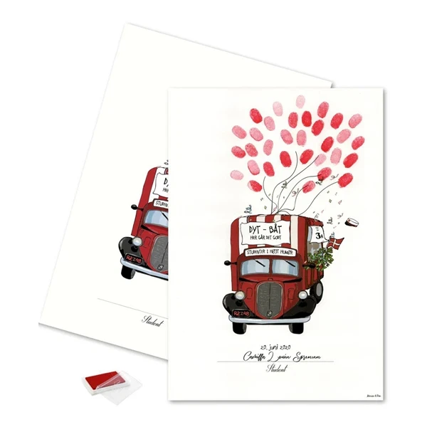 Giv din studenterfest et uforglemmeligt touch med denne gæsteplakat i rød! Denne charmerende plakat med en flot rød studentervogn er det perfekte supplement til din fest, hvor både familiemedlemmer, venner og klassekammerater kan efterlade deres fingeraftryk som et evigt minde om dagen.