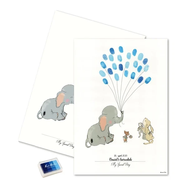 Dette gæsteplakat med fingeraftryk fra Kija‑Design.dk giver dine gæster mulighed for at medvirke aktivt til festen og blive en del af noget særligt – især til barnedåb eller 1 års fødselsdag. Plakaten har et sødt elefantmotiv og leveres med blå stempelfarver, så både små og store kan trykke deres fingertip og tilføje en personlig hilsen, som varige minder.