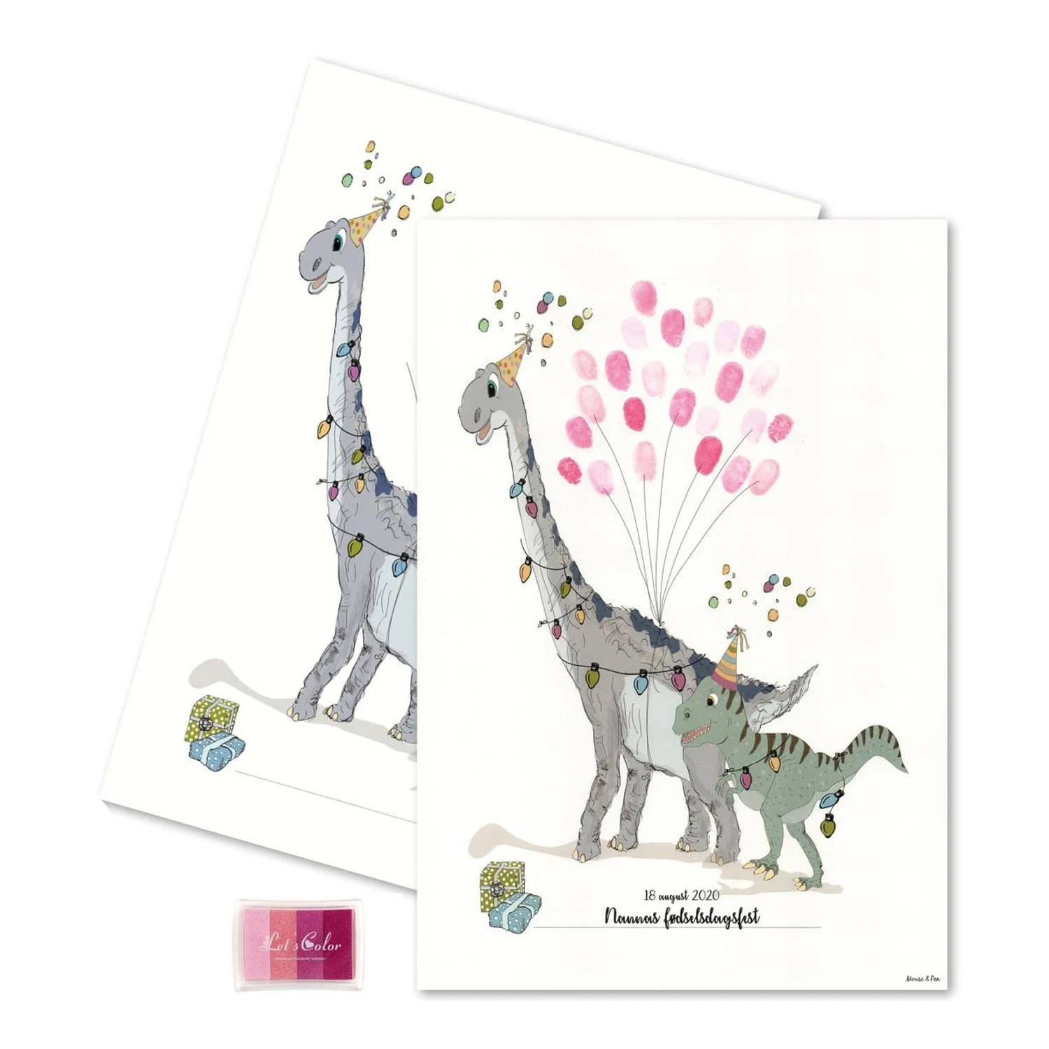 Gæsteplakat med fingeraftryk i lyserød fra Kija‑Design.dk er perfekt til barnedåb eller 1 års fødselsdag, når du vil give dine gæster mulighed for at sætte deres fingeraftryk som minde. Denne plakats størrelse (42 cm × 29,7 cm) gør den let at indramme og hænge op, så den kan ses igen og igen. Hvid baggrund kombineret med lyserøde stempelfarver skaber en varm og personlig effekt, som samtidig matcher mange festtemaer, herunder dinosaur‑motivet. Plakaten medfølger lyserød stempelfarve, så alt er klar til brug – ingen ekstra udstyr nødvendigt.