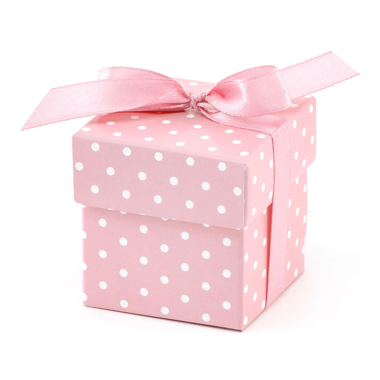 Den lyserøde farve og de hvide polkaprikker gør gaveæskerne perfekte til pigers babyshower, barnedåb og konfirmation eller til et romantisk bryllup.