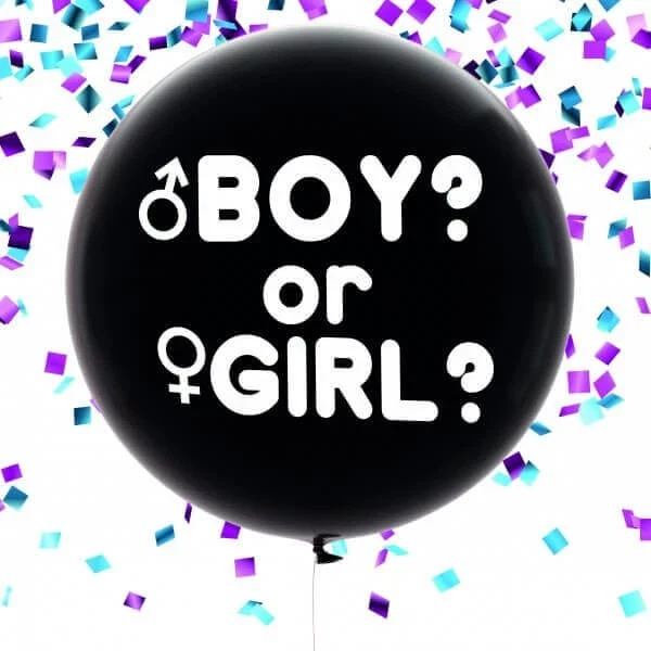 Gender reveal ballon 90 cm sort ballon med teksten Boy or Girl og konfetti til babyshower