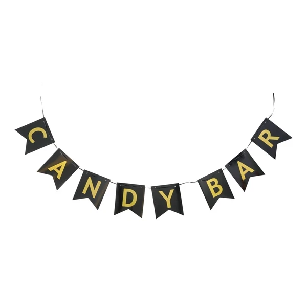 Har du besluttet dig for at lave en candy bar eller -buffet i den ene ende af festlokalet eller i et hjørne, så kan denne flotte guirlande vise gæsterne vej til de søde sager. Det er otte sorte vimpler på et satinbånd. Hver vimpel har et guldbogstav påtrykt, så de tilsammen danner ordene CANDY BAR. Enkelt design, men festligt ser det ud.