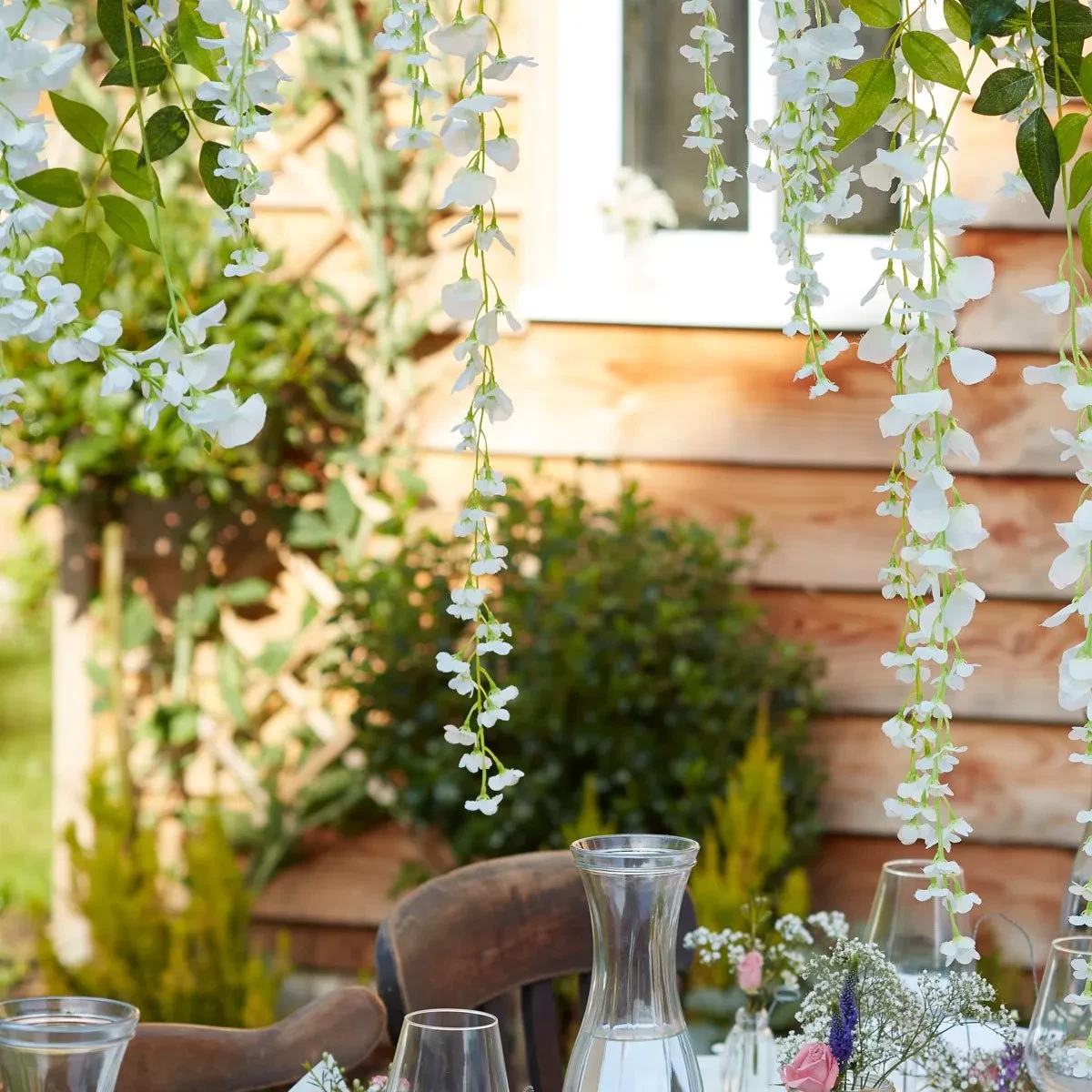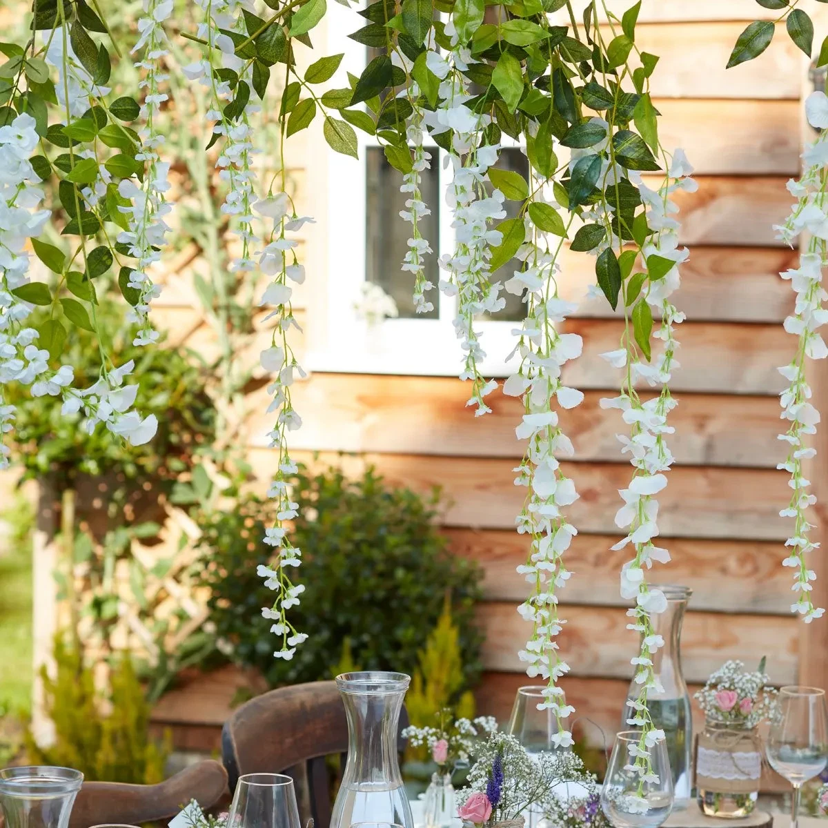Denne enkelte blomst kan bruges sammen med flere til en buket eller bruges som en guirlande hen over f.eks. døråbningen eller bordet. Guirlanden har hvide blomsterstande og grønne blade. Smukt og sommerligt og en nem og hurtig måde at give udsmykningen et naturligt look.