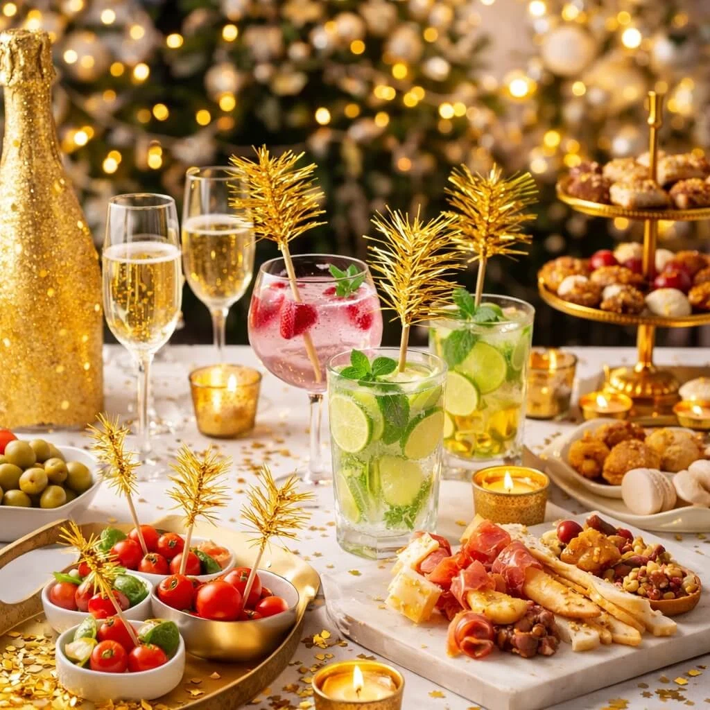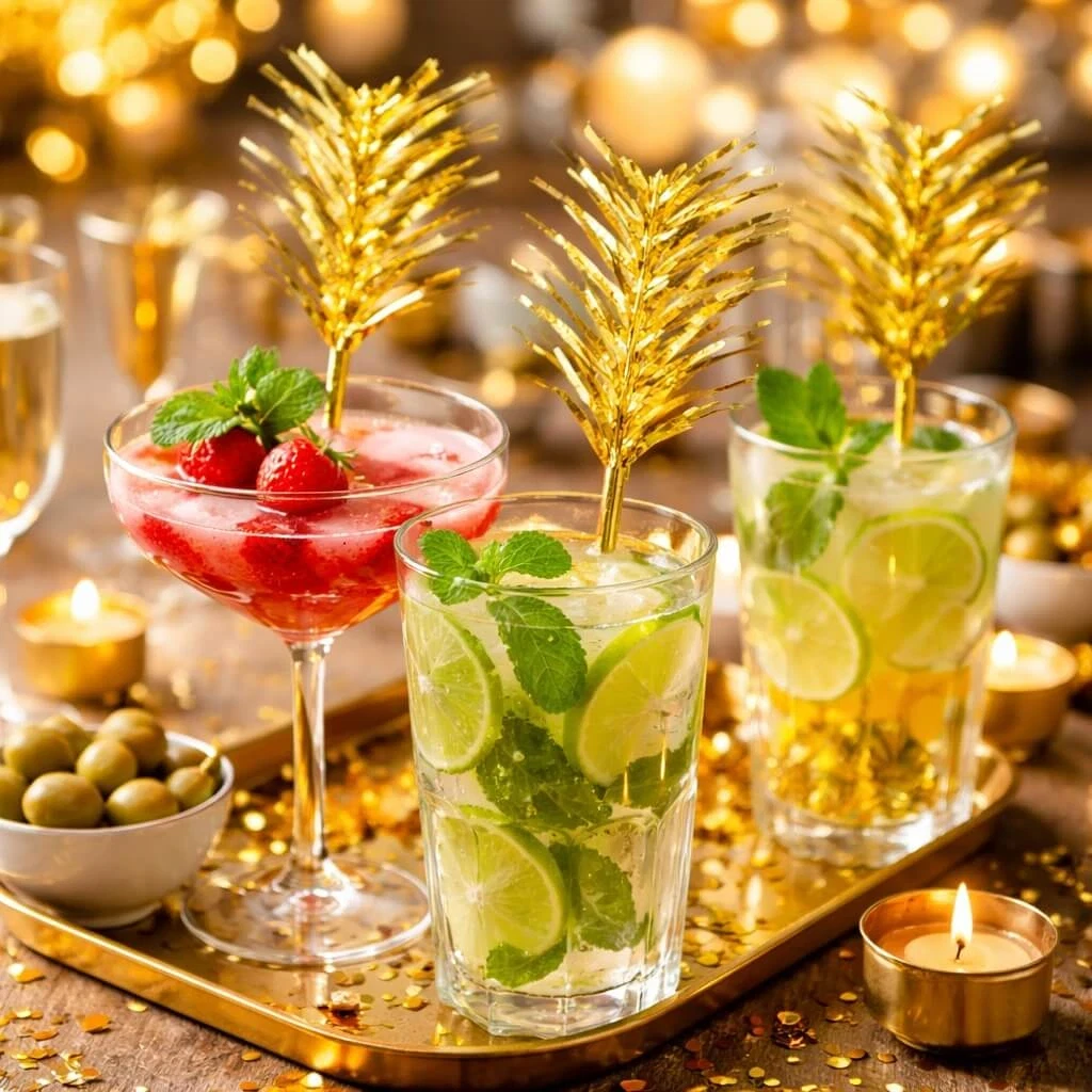 Guld folie drinks pyntepinde 10 cm pakke med 20 stk til cocktails og festCocktails pyntet med guld folie drinks pyntepinde på festligt bord med lys og snacksFestligt buffetbord med cocktails pyntet med guld folie drinks pyntepinde og snacksCocktails med guld folie drinks pyntepinde på festligt bord med lys og snacks
