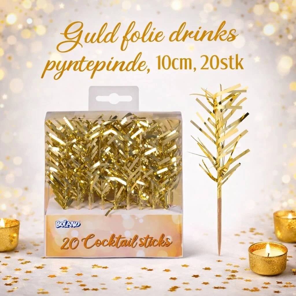 Disse guld drinks pyntepinde er den perfekte detalje, når dine serveringer skal have et elegant og festligt udtryk. Med deres dekorative guldfolie tilfører de et eksklusivt touch til alt fra cocktails og mocktails til tapas, frugt og små appetizers. De er ideelle til både private fester og professionelle arrangementer, hvor præsentationen er lige så vigtig som smagen.