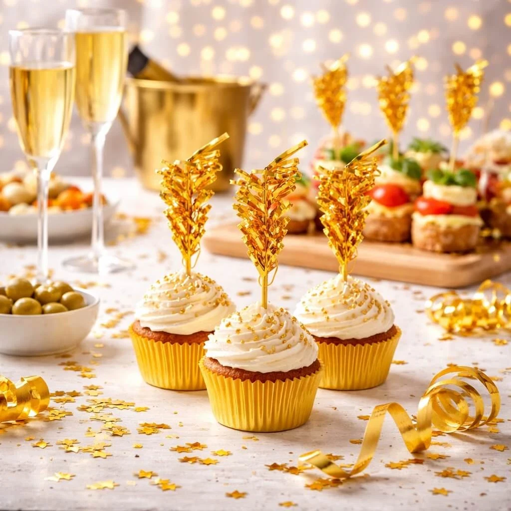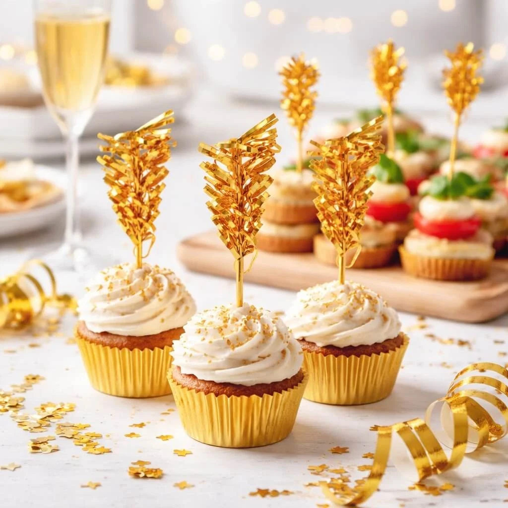 Disse guld folie pyntesticks på 10,5 cm er den perfekte detalje til dig, der ønsker at løfte præsentationen af mad og drikke. Uanset om du planlægger bryllup, fødselsdag, nytårsfest eller et stilfuldt arrangement, tilfører de en elegant og festlig finish.