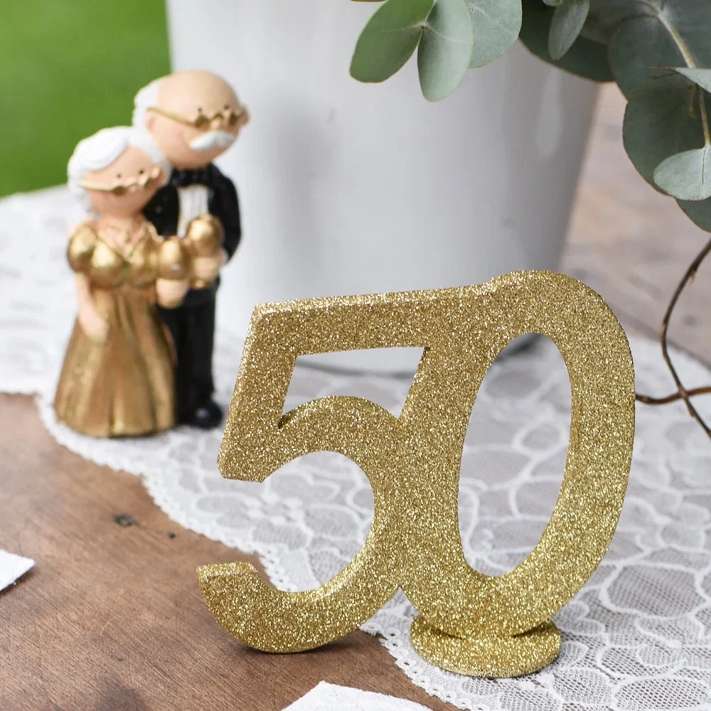 Fint 50-tal i guldglimmer med rund fod. Det kan bruges som borddekoration til guldbryllup, jubilæum eller en 50-års fødselsdag.