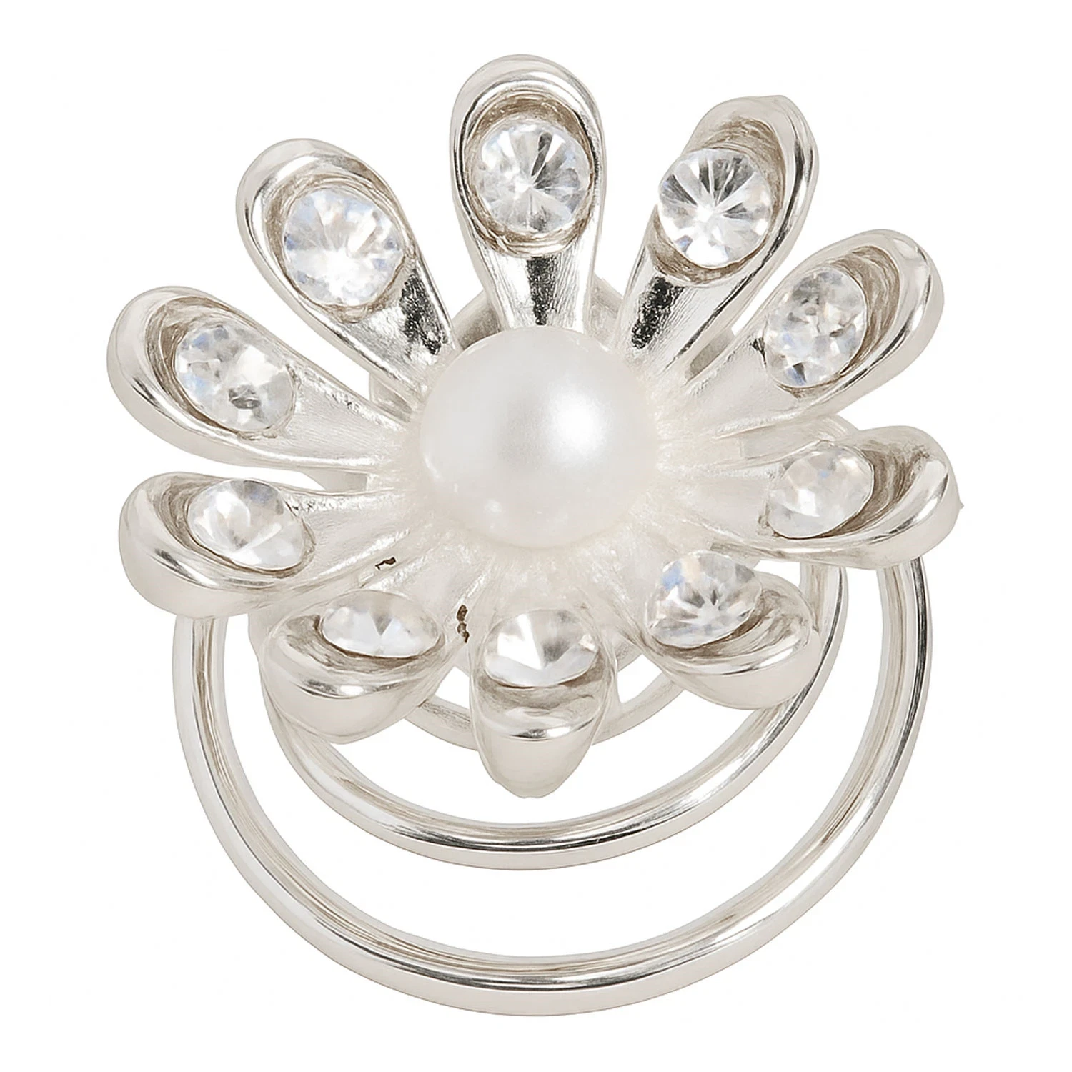 Med 10 indfattede rhinsten formet som kronbladene i en åben blomst og en midte med en stor, rund, hvid perle skal denne hårspiral nok vække opsigt og skabe det helt rigtige look til din frisure. Det er super flot at sætte hårspiraler flere steder spredt rundt om i din frisure.