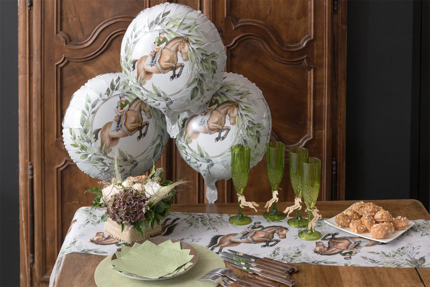Gør fødselsdagen ekstra magisk med denne smukke folieballon med hestemotiv. Ballonen er dekoreret med en elegant hest og rytter omgivet af grønne blade – perfekt til små hestefans og ride-entusiaster.
