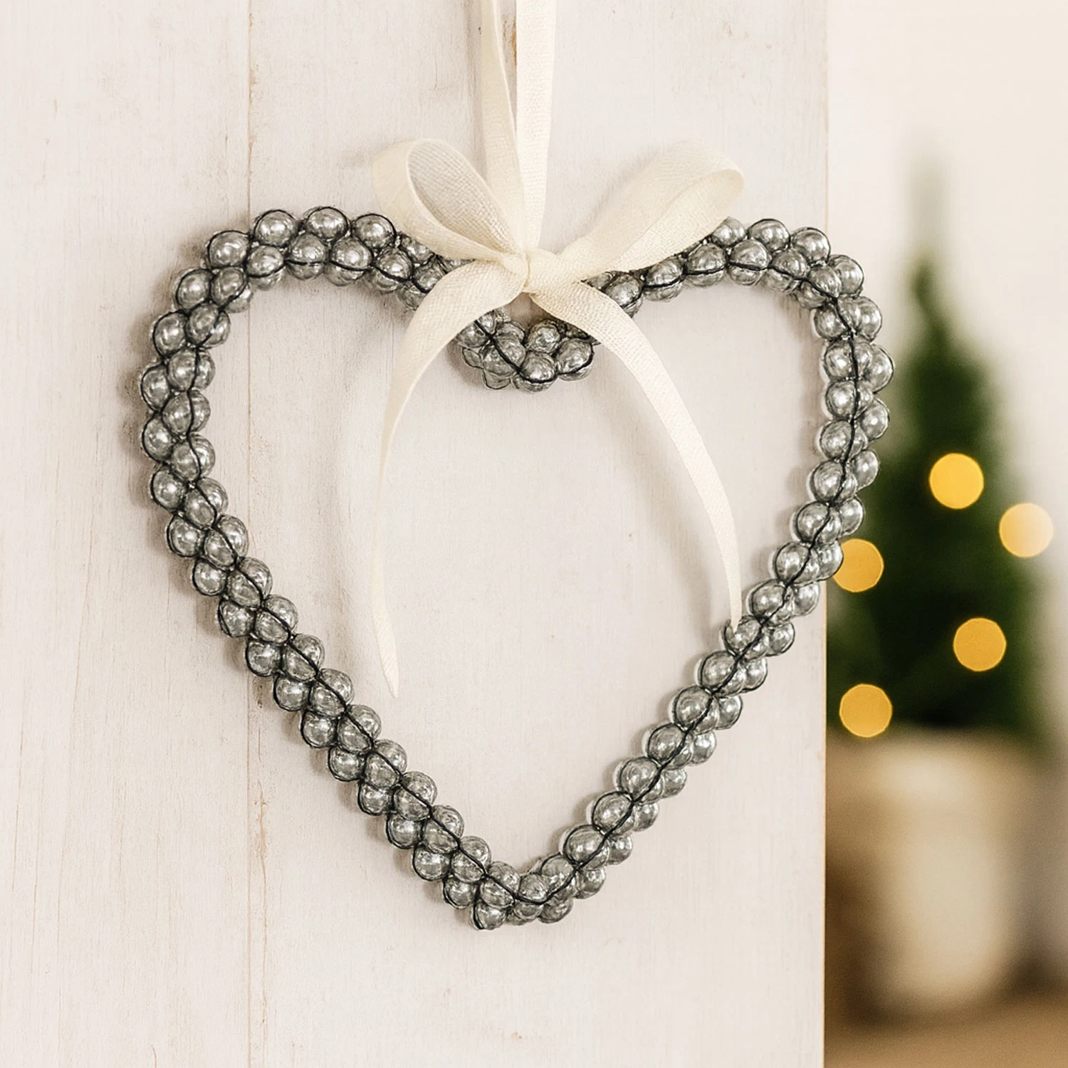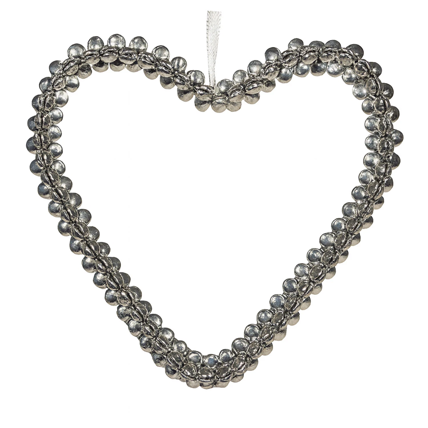 Dette hjerte er lavet af små søde klokker, som har den fineste klang. Rigtig sød at bruge til bryllup - eventuelt med en blondesløjfe bundet på - eller i boligindretningen derhjemme. Eller læg den som dekoration på et fad med fyrfadsstager, bloklys, hjertekrystaller eller hjertekonfetti.