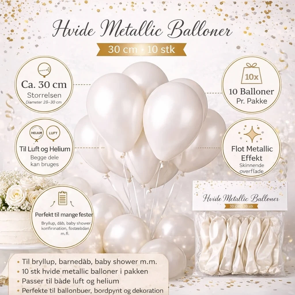 Hvid metallic ballon 30 cm med skinnende overflade til fest og dekorationHvide metallic balloner 30 cm 10 stk i pakke med oppustede balloner til fest dekorationHvide metallic balloner dekoration med kagebord til bryllup baby shower og festHvide metallic balloner brugt til bryllup dekoration med ballonbue og festbordClose-up af hvid metallic ballon med skinnende overflade og ballonbånd til fest dekorationInfografik med hvide metallic balloner 30 cm 10 stk til bryllup baby shower og fest dekoration