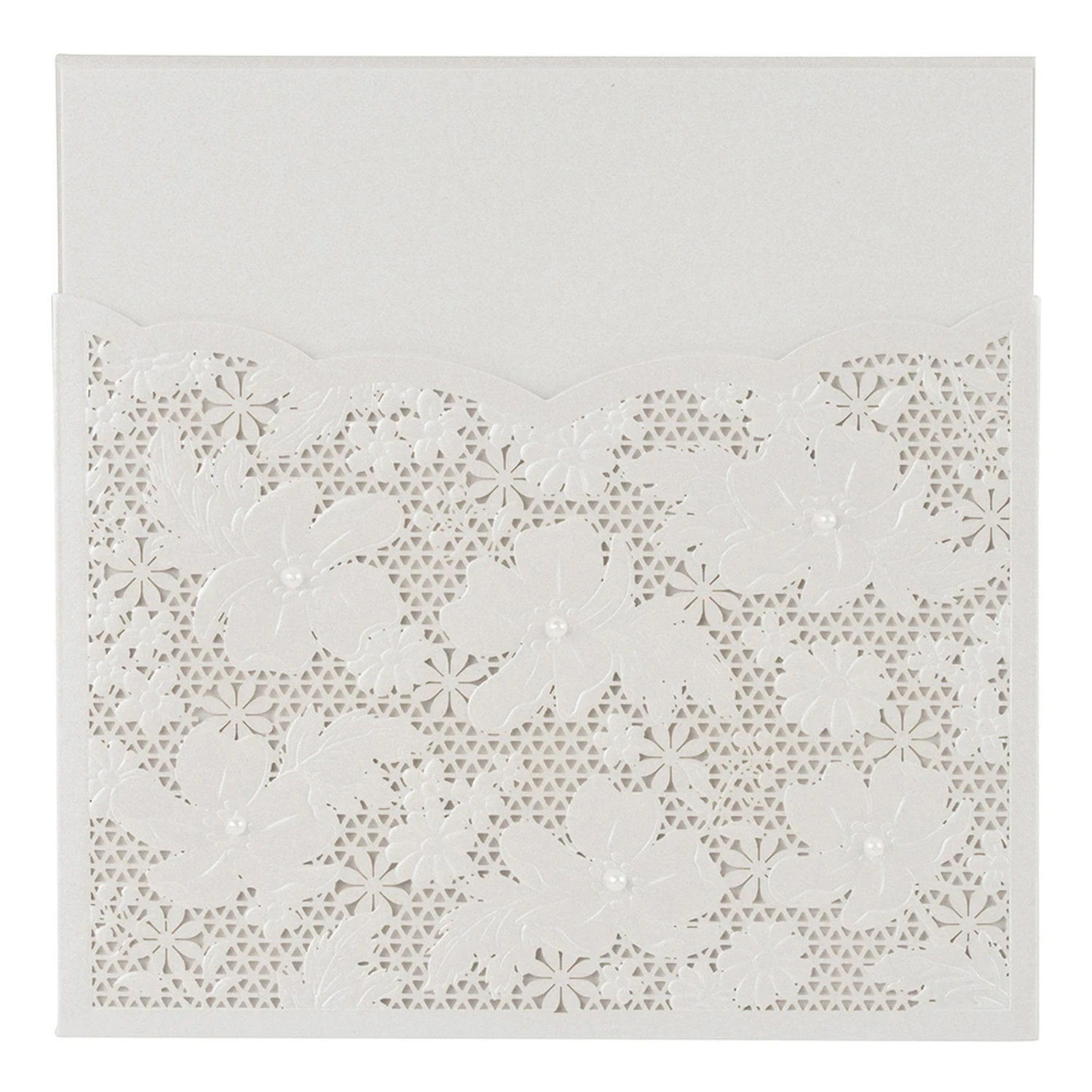 Inviter gæsterne til konfirmation, bryllup eller en anden stor begivenhed med denne smukke indbydelse. Den er i tre dele – 1 indlægsark, 1 omslag og 1 kuvert. Alle dele er hvide med et eksklusivt skinnende perlemorsskær.