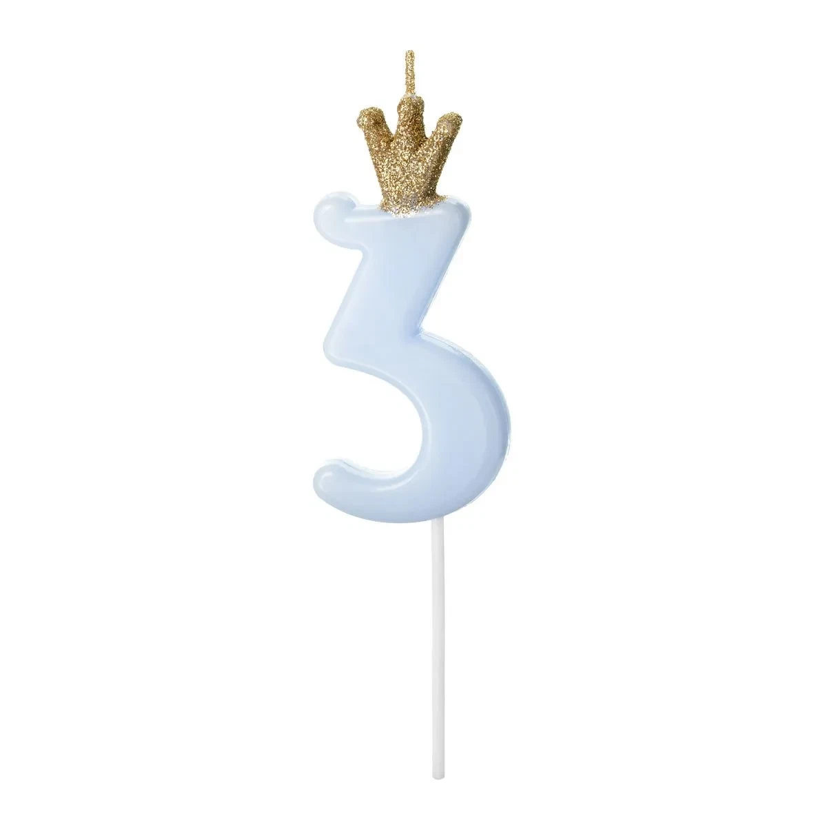 Kagelys Kongekrone tal 3 lyseblå/guld 9,5cm kagepyntKagelys Kongekrone tal 3 lyseblå/guld 9,5cm fødselsdagslys