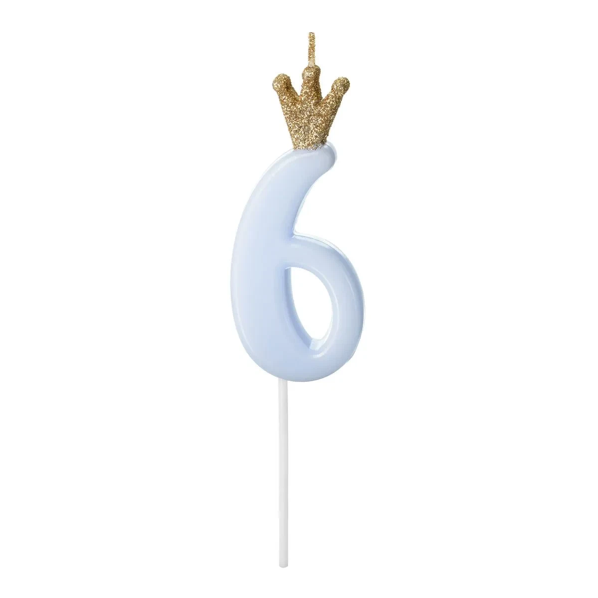 Kagelys Kongekrone tal 6 lyseblå/guld 9,5cm kagepyntKagelys Kongekrone tal 6 lyseblå/guld 9,5cm fødselsdagslys