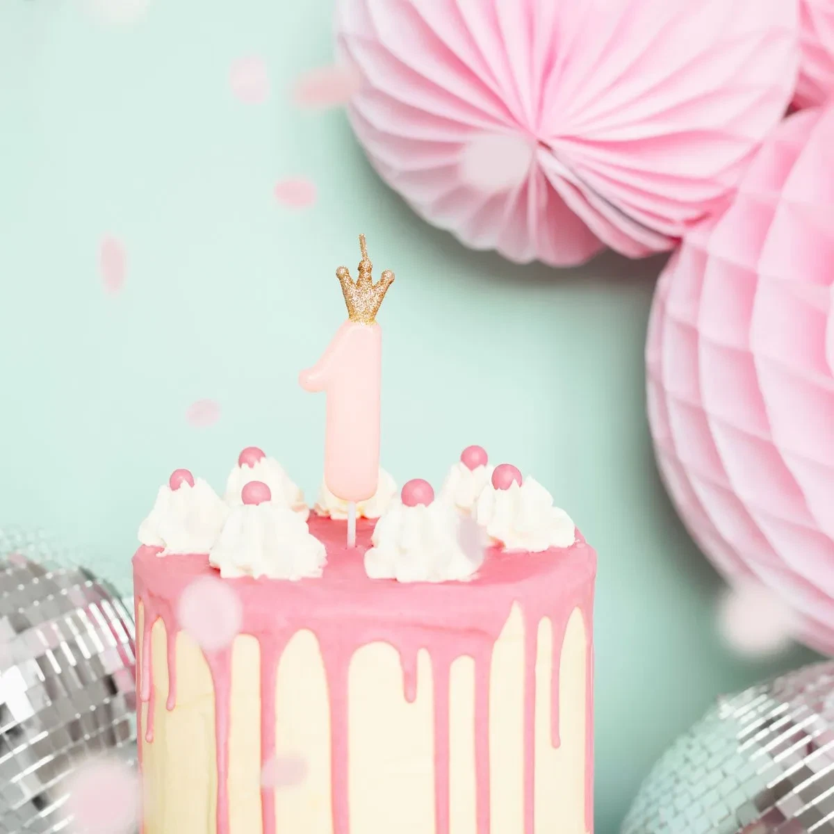 Kagelys Prinsessekrone tal 1 lyserød/guld 9,5cm kagepyntKagelys Prinsessekrone tal 1 lyserød/guld 9,5cm fødselsdagslys
