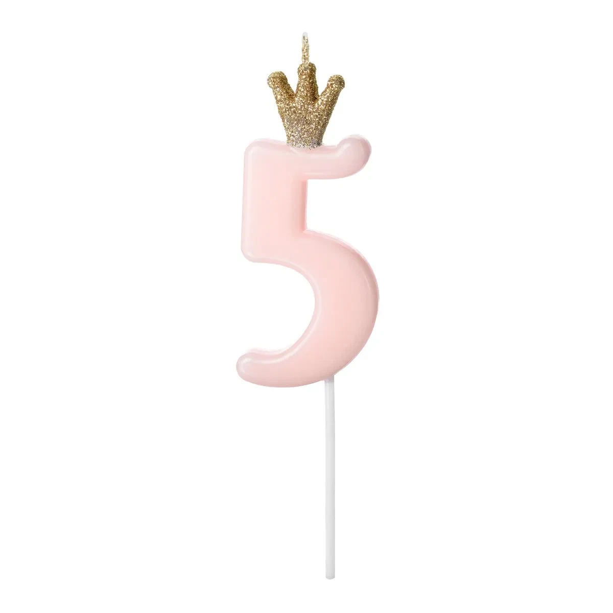 Kagelys Prinsessekrone tal 5 lyserød/guld 9,5cm kagepyntKagelys Prinsessekrone tal 5 lyserød/guld 9,5cm fødselsdagslys