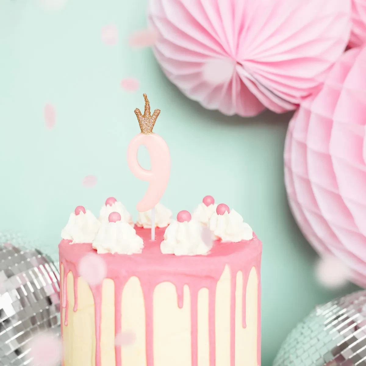 Kagelys Prinsessekrone tal 8 lyserød/guld 9,5cm kagepyntKagelys Prinsessekrone tal 8 lyserød/guld 9,5cm fødselsdagslys