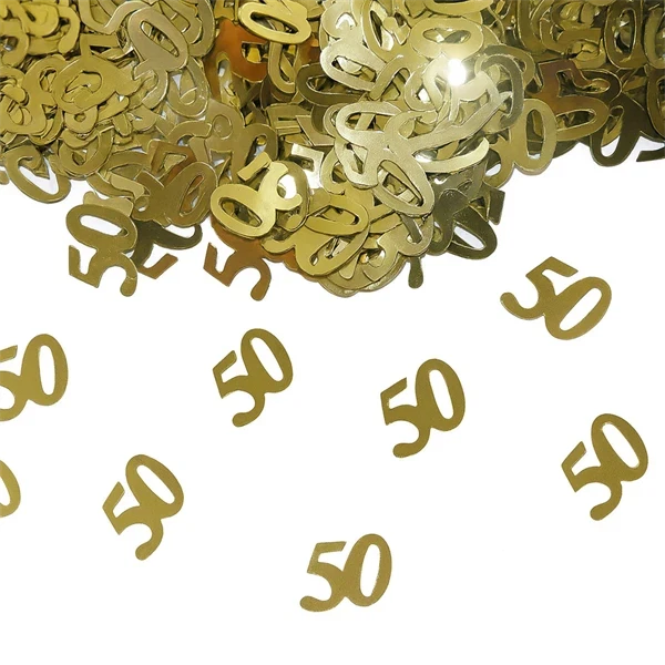 Her får du festligt strøpynt til dit guldbryllup, din 50 års fødselsdag eller et 50 års jubilæum. Drys på festbordet eller pynt bordkortene og invitationerne med 50-tallene.