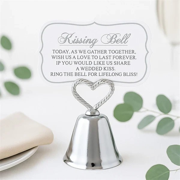 Gør jeres bryllupsfest endnu mere mindeværdig med vores elegante kysseklokker, der både fungerer som bordkortholdere og tilføjer et romantisk touch til borddækningen. Disse smukke klokker i sølvfarvet metal er designet til at holde et bordkort og inviterer samtidig gæsterne til at deltage i en charmerende bryllupstradition.