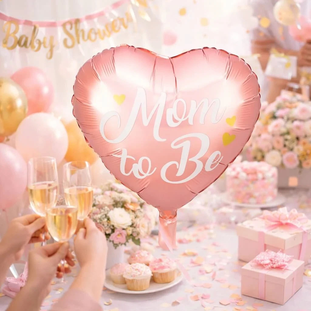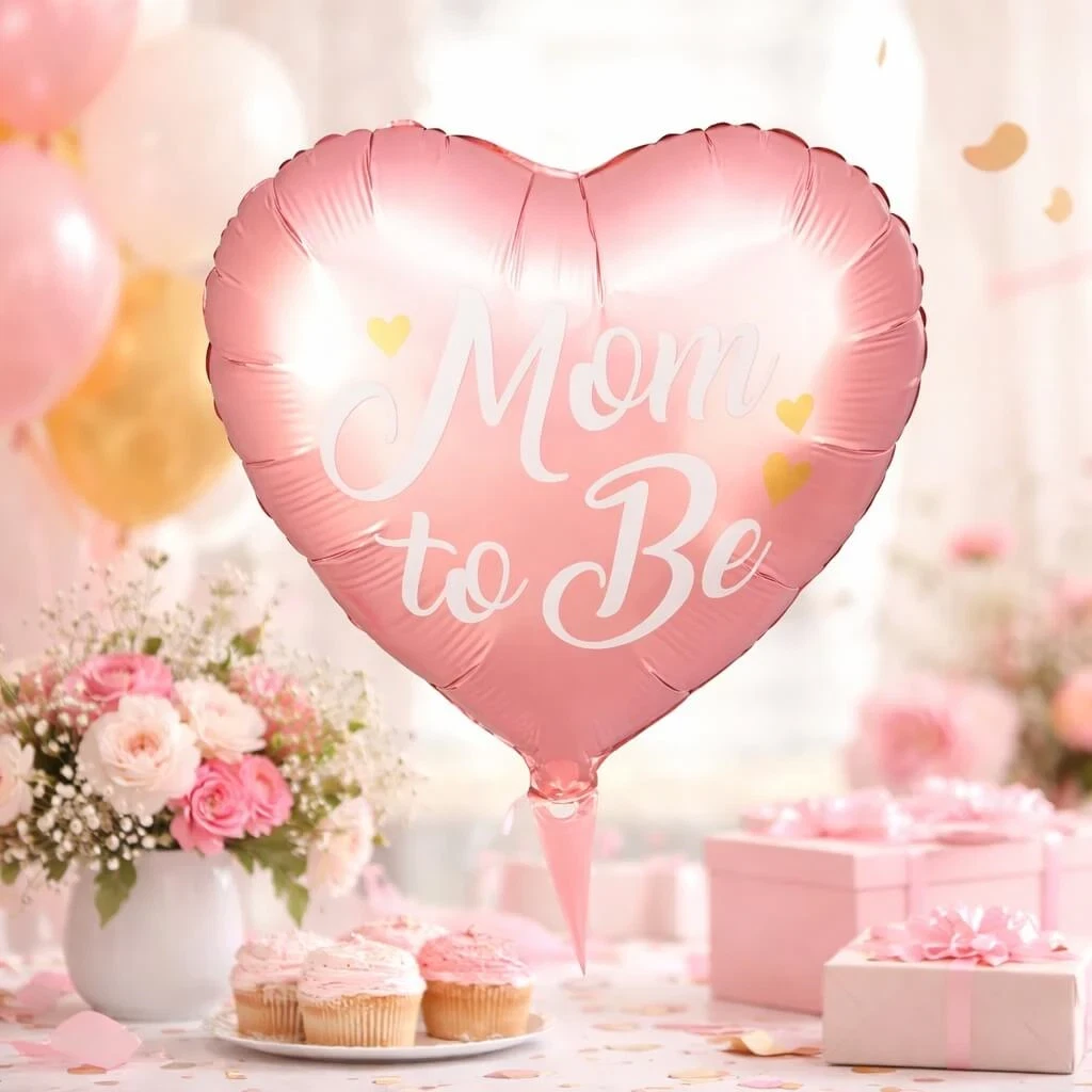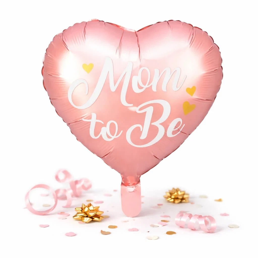 • Hjerteformet folieballon med teksten “Mom to Be”