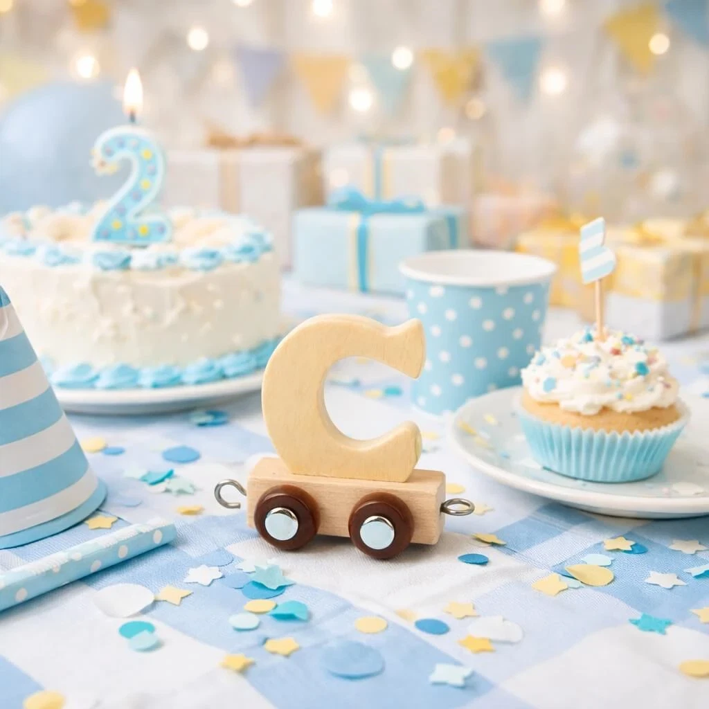 Navnetog bogstav C i naturtræ på træskinner i hyggeligt børneværelse med bamse og regnbue i baggrundenNavnetog bogstav C i naturtræ brugt som personlig bordpynt til børnefødselsdag med kage og cupcakeNavnetog bogstav C i naturtræ brugt som personlig bordpynt til børnefødselsdag med kage, cupcake og blå festdekorationer