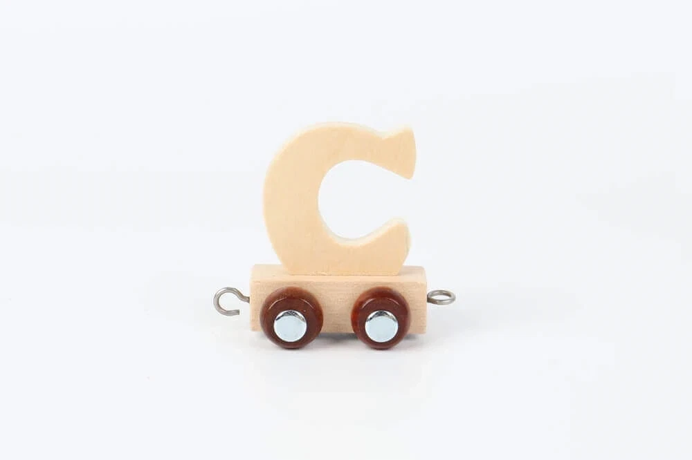 Personligt navnetog bogstav C i naturtræ. Passer til BRIO-kompatible skinner og kan kombineres med andre bogstaver. Perfekt gave til børn.
