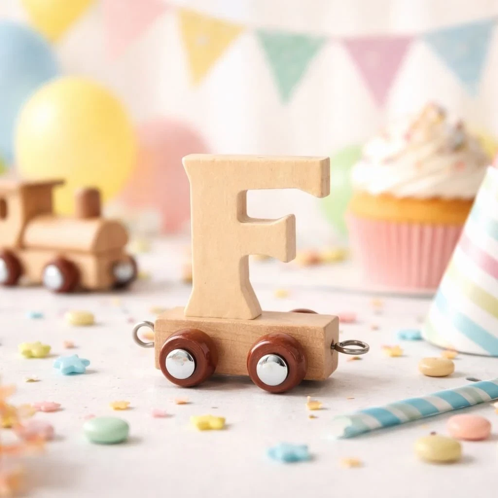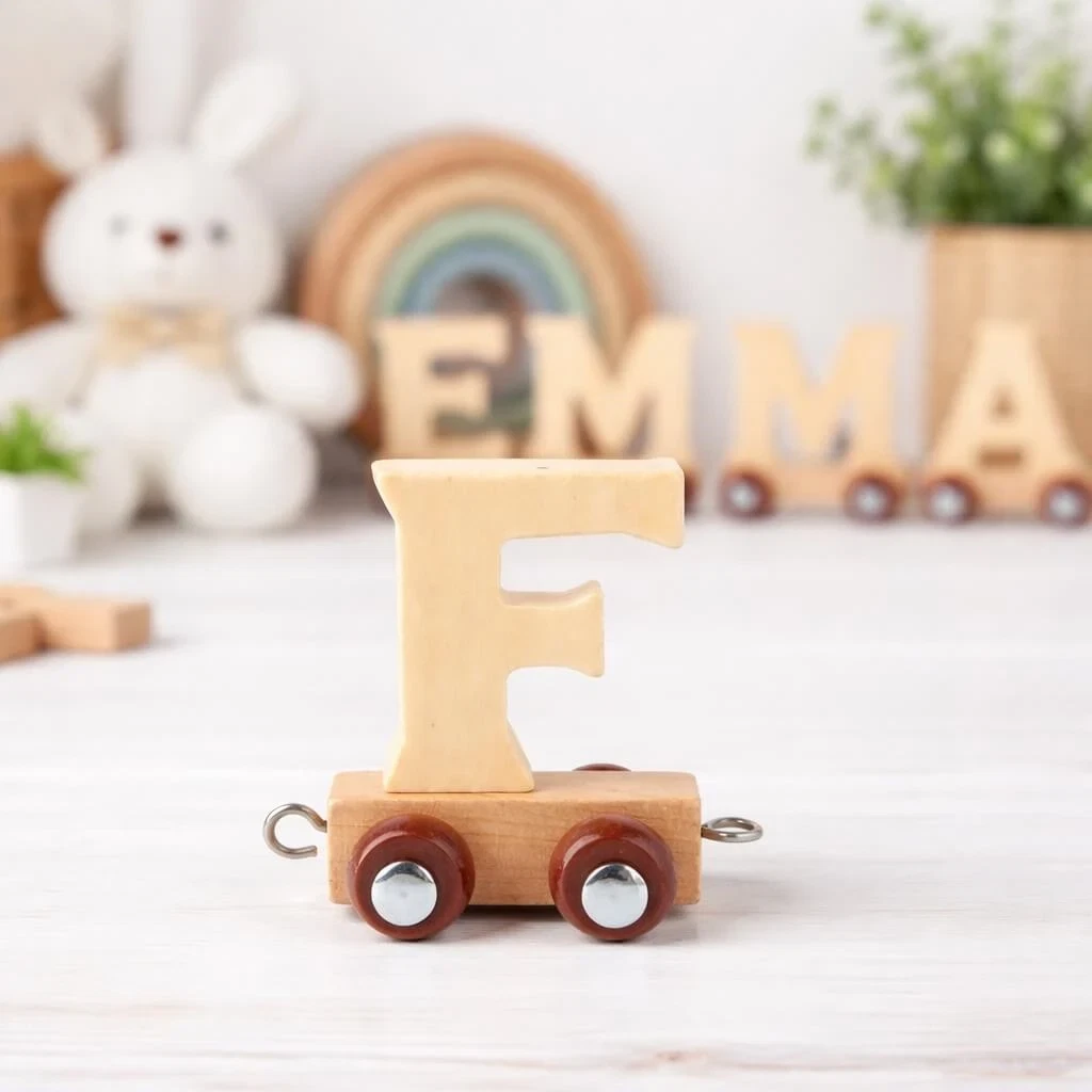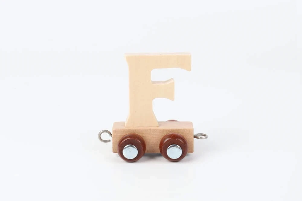 Navnetog bogstav F i naturtræ som trælegetøj på børneværelse med bamse, regnbue og plante i baggrundenNavnetog bogstav F i naturtræ som trælegetøj på bord med farverig børnefødselsdag pynt, cupcake og balloner i baggrundenNavnetog bogstav F i naturtræ som trælegetøj togvogn på hvid baggrund
